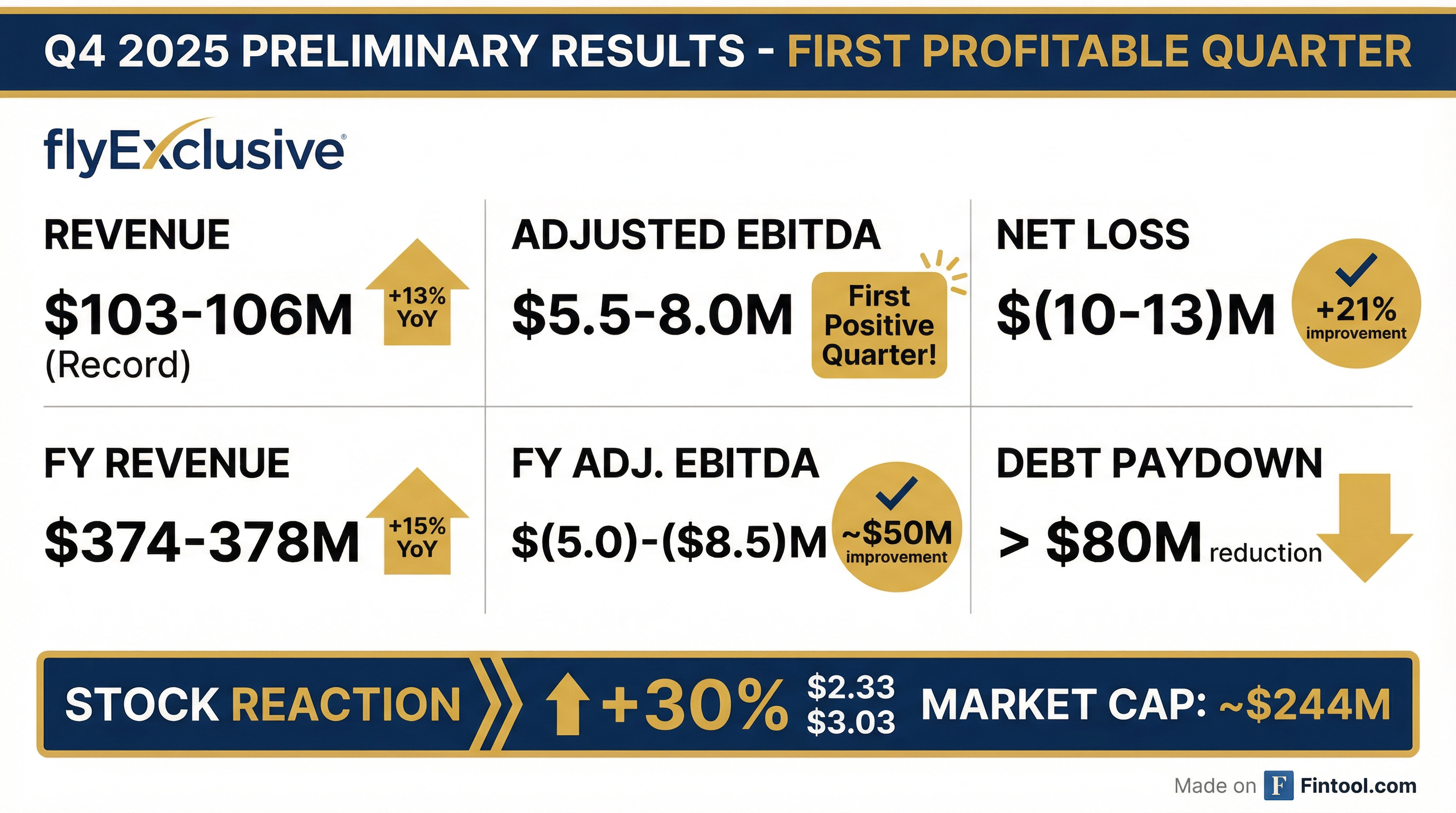 - flyExclusive, Inc. (FLYX) reported record preliminary unaudited revenue for Q4 2025, expected to be between $103.0 million and $106.0 million, a 13% increase year-over-year, and full year 2025 revenue, expected between $374.0 million and $378.0 million, a 15% increase year-over-year.