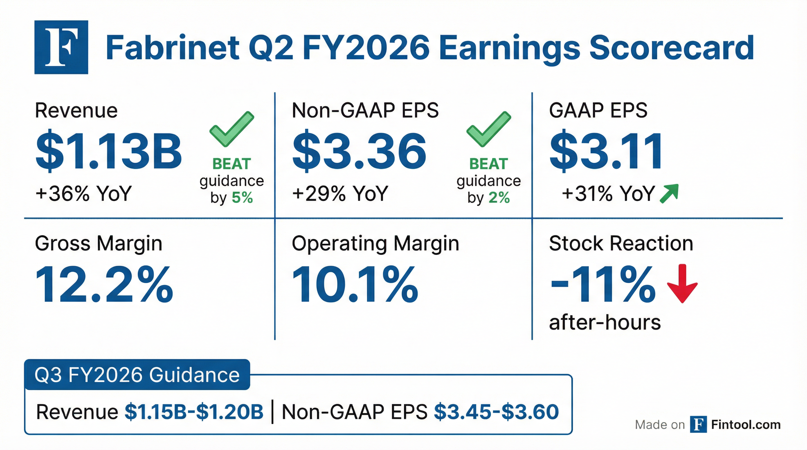 - Fabrinet achieved record Q2 fiscal year 2026 revenue of $1.13 billion, a 36% year-over-year increase, and non-GAAP EPS of $3.36, both exceeding guidance ranges.