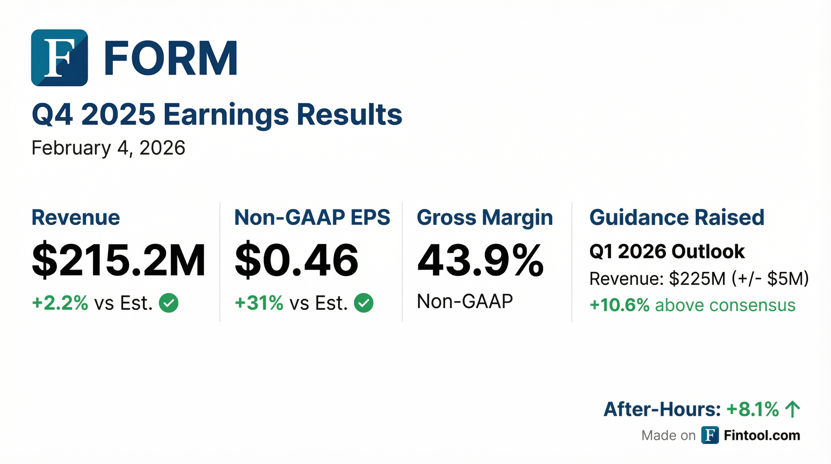 - Form Factor reported strong Q4 2025 actual results, with revenue of $215.2 million, Non-GAAP gross margin of 43.9%, and Non-GAAP diluted EPS of $0.46, all exceeding the high end of its outlook range.