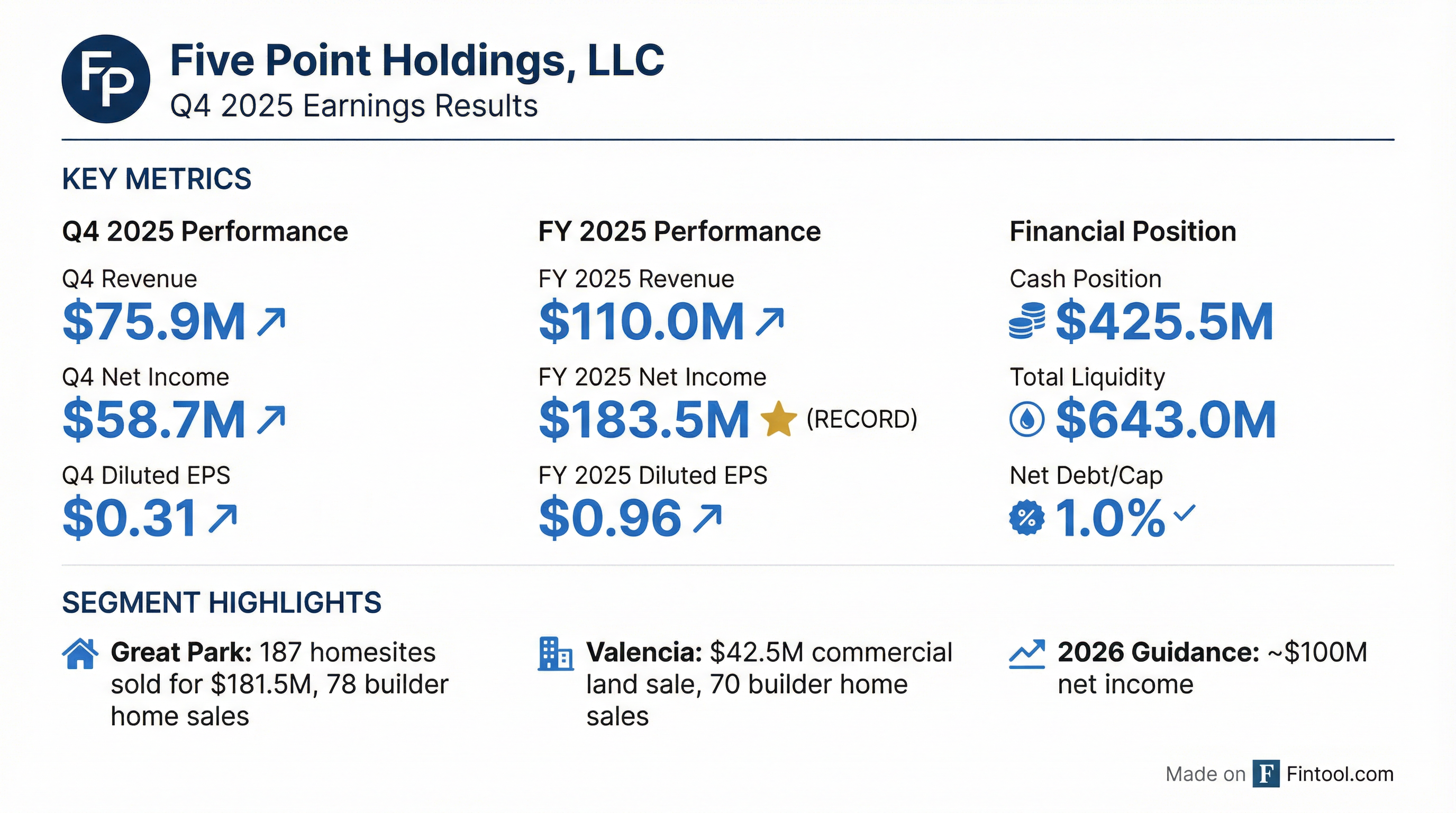 - Five Point Holdings, LLC reported record consolidated net income of $183.5 million for the full year 2025, exceeding its revised guidance, with $58.7 million in consolidated net income for Q4 2025.