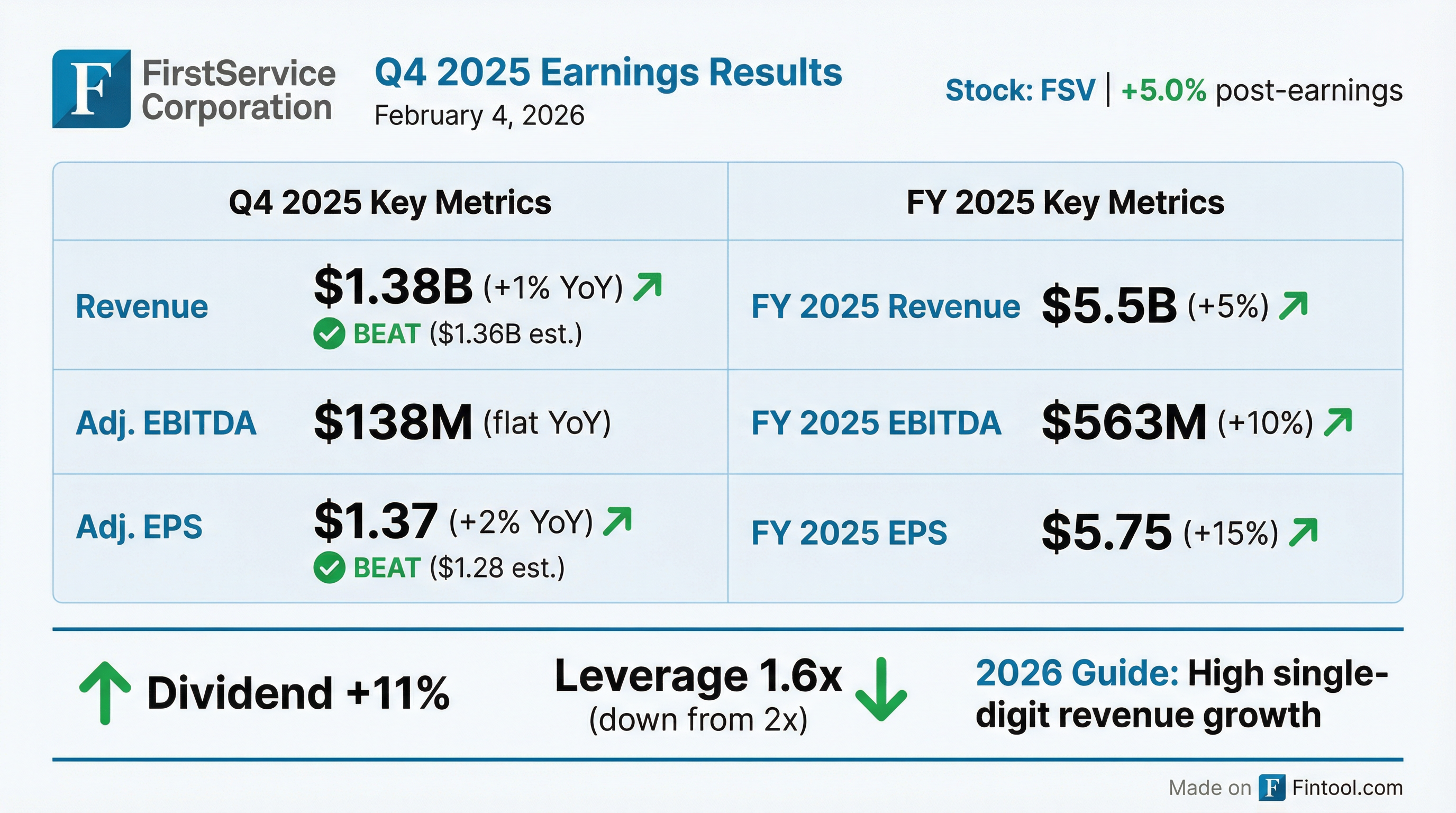 FSV announced an 11% dividend increase to $1.22 per share annually. Acquisition spending during 2025 totaled $107 million, and the company ended the year with a 1.6x net debt to Adjusted EBITDA and $970 million in liquidity.