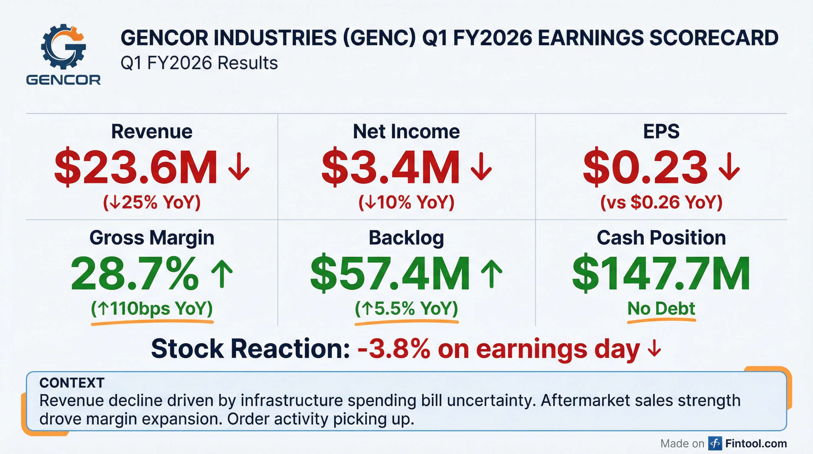 - Gencor Industries, Inc. reported net revenue of $23,577,000 for the quarter ended December 31, 2025, a decrease from $31,416,000 in the prior year's quarter, primarily due to delays and uncertainty regarding the Federal infrastructure spending bill.