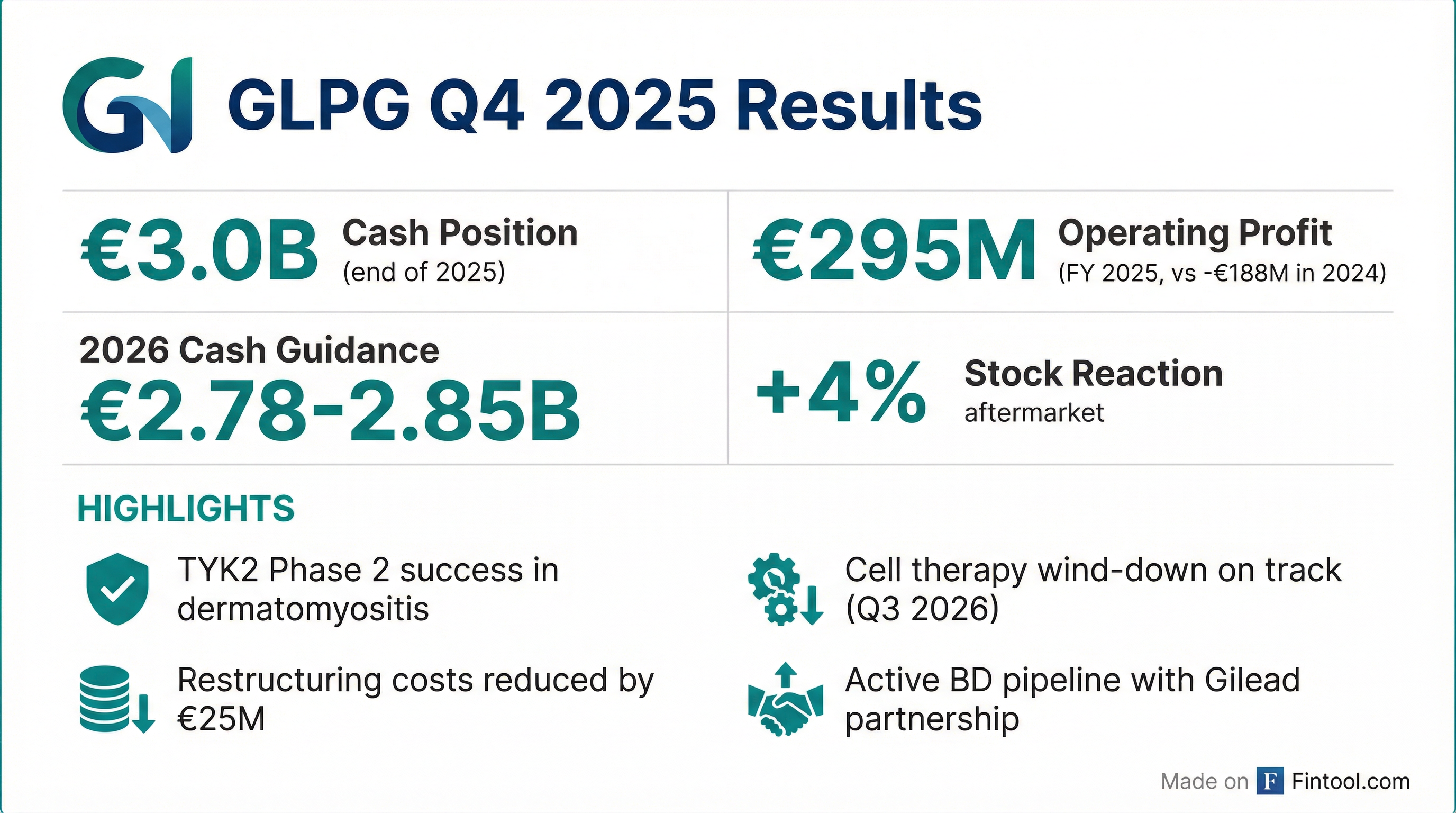 - Galapagos is undergoing a strategic transformation, including winding down its cell therapy activities, which negatively impacted 2025 operating expenses by EUR 399.8 million and is expected to incur one-time restructuring cash impacts of EUR 125 million-EUR 175 million in 2026. The wind-down is anticipated to be substantially completed by the end of Q3 2026.