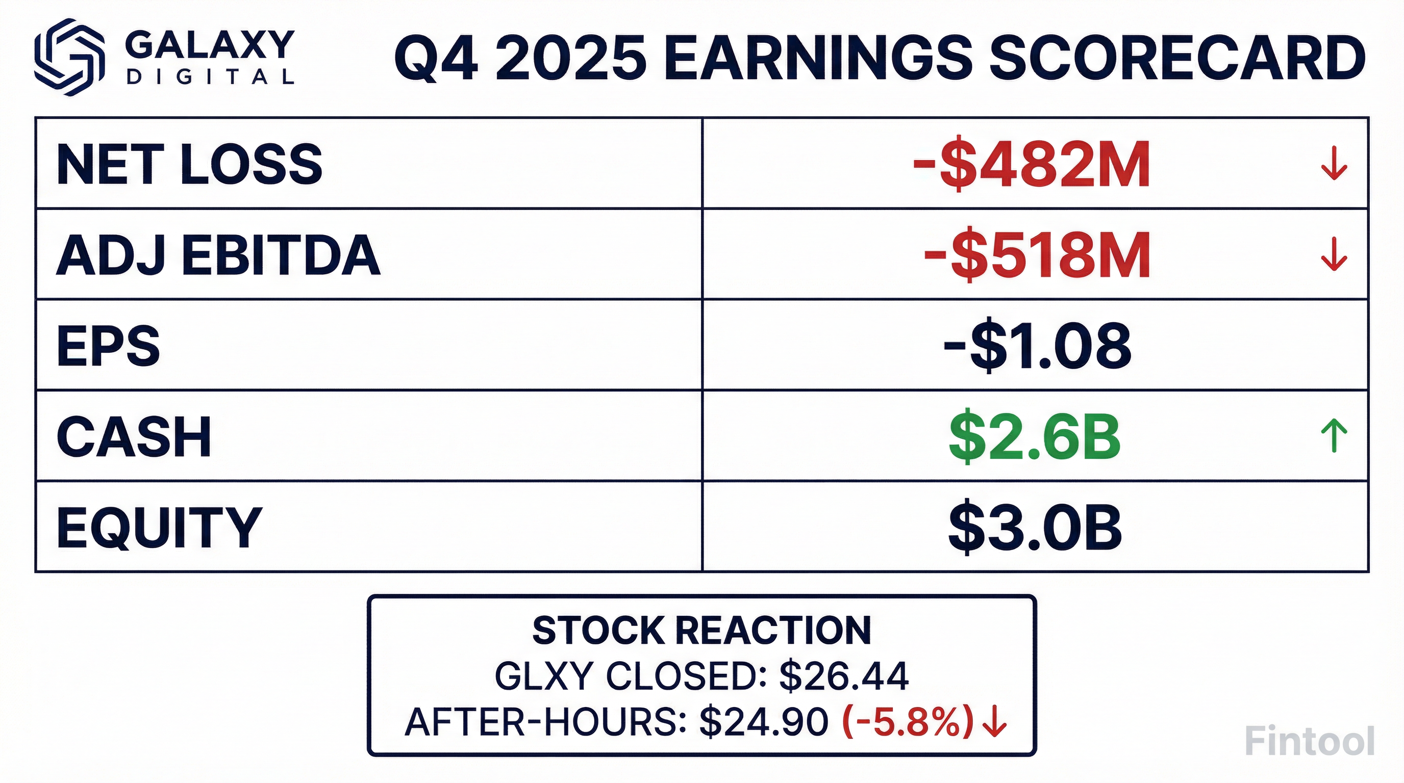 - Galaxy Digital Inc. reported a net loss of $482 million for Q4 2025 and a full year 2025 net loss of $241 million, with diluted EPS of $(1.08) and $(0.61) respectively, primarily driven by the depreciation of digital asset prices.