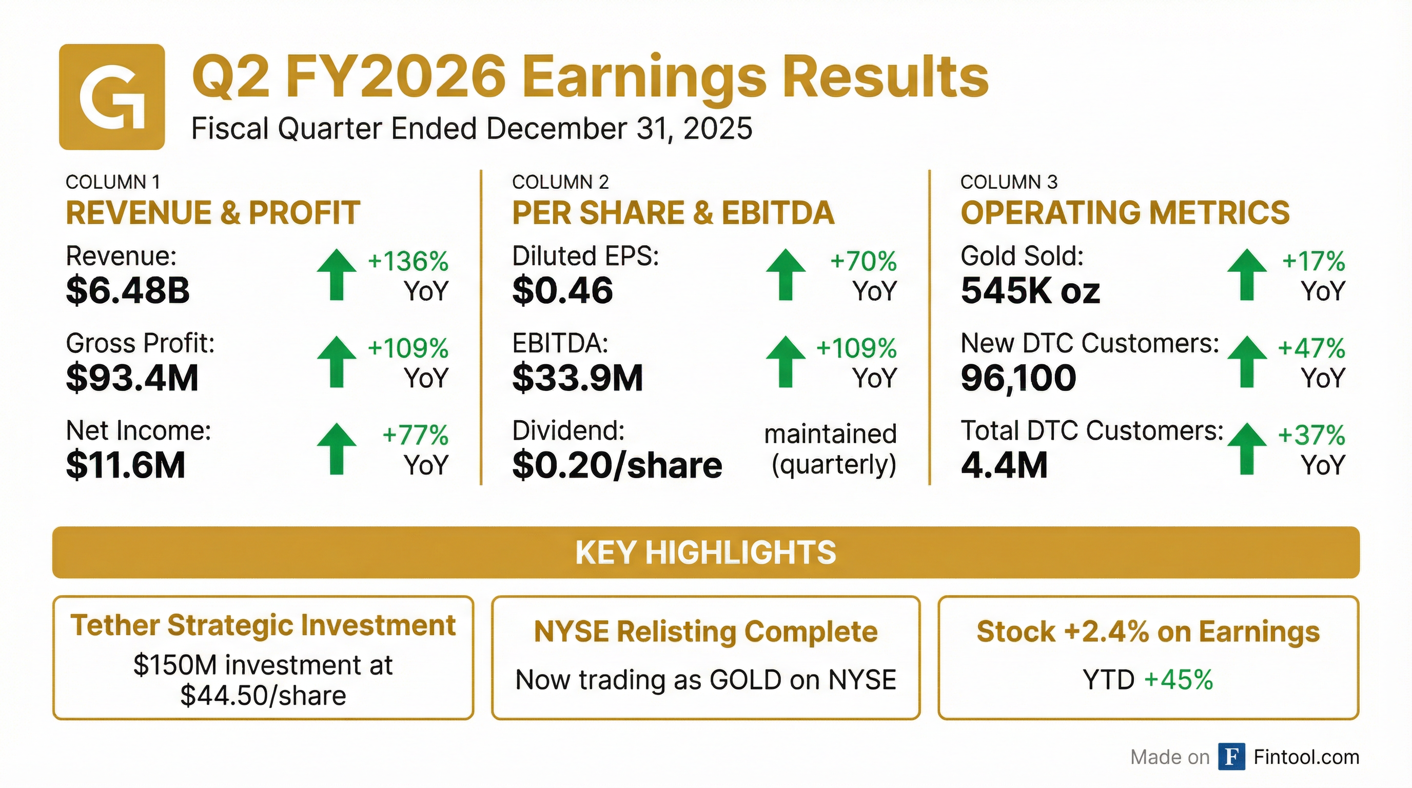 - Gold.com reported diluted earnings per share of $0.46 and net income of $11.6 million for the fiscal second quarter ended December 31, 2025.