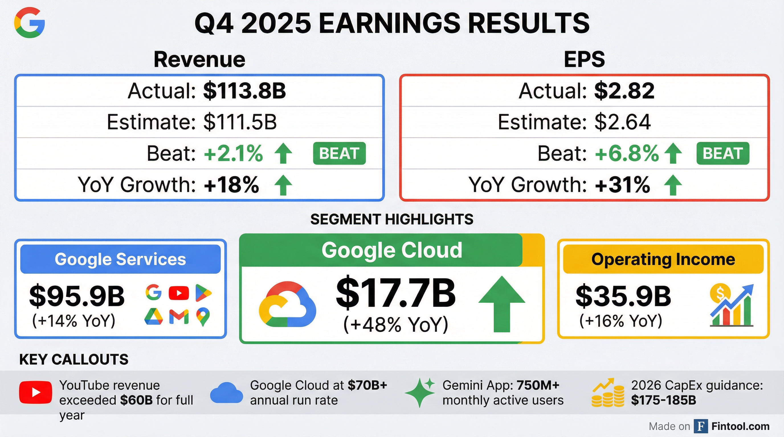 - Alphabet reported $402.84 billion in 2025 revenue and $113.83 billion in Q4, marking its first annual revenue above $400 billion.