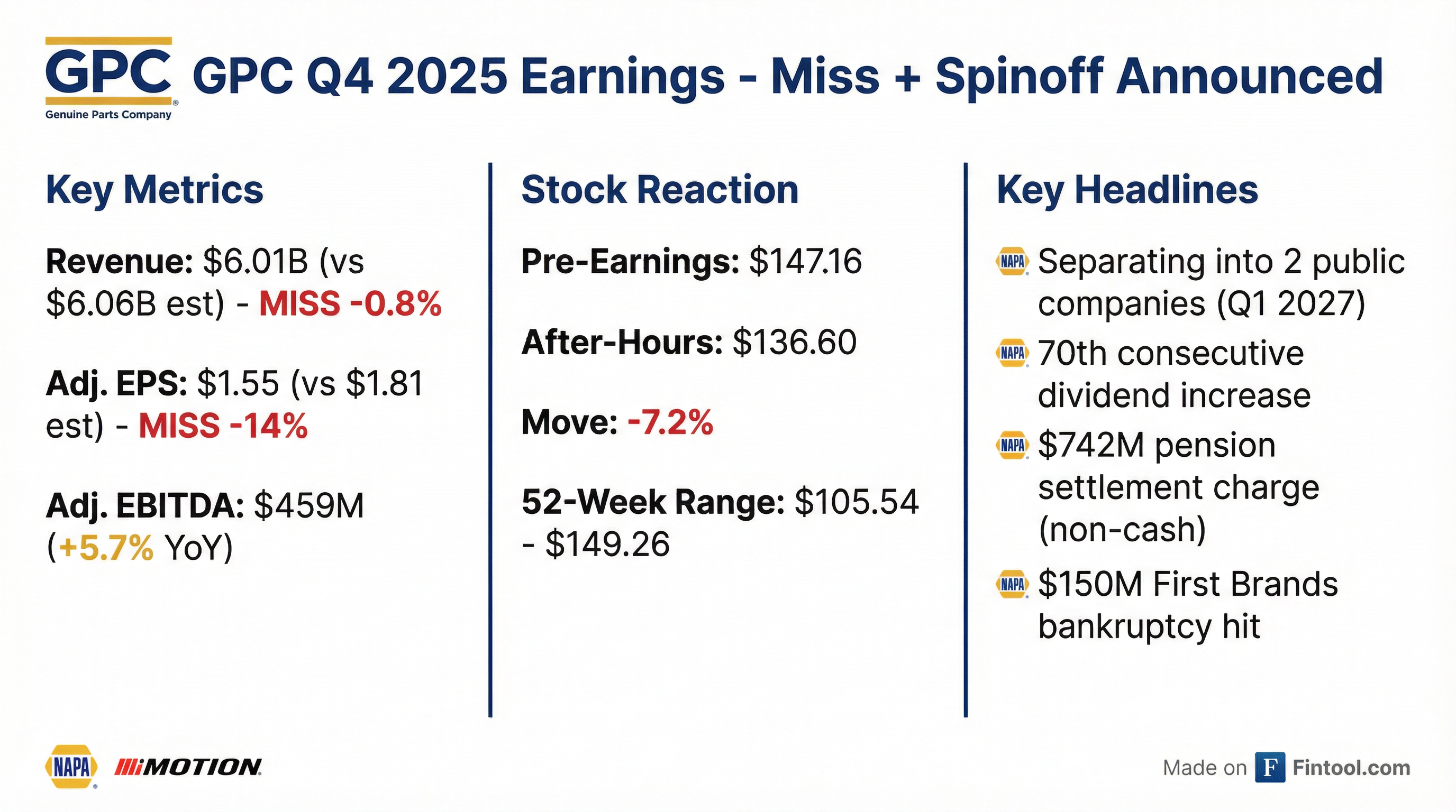 - Announces intent to split into two publicly traded companies—Global Automotive (NAPA) and Global Industrial (Motion)—targeting completion in Q1 2027 to unlock value and tailor growth strategies.