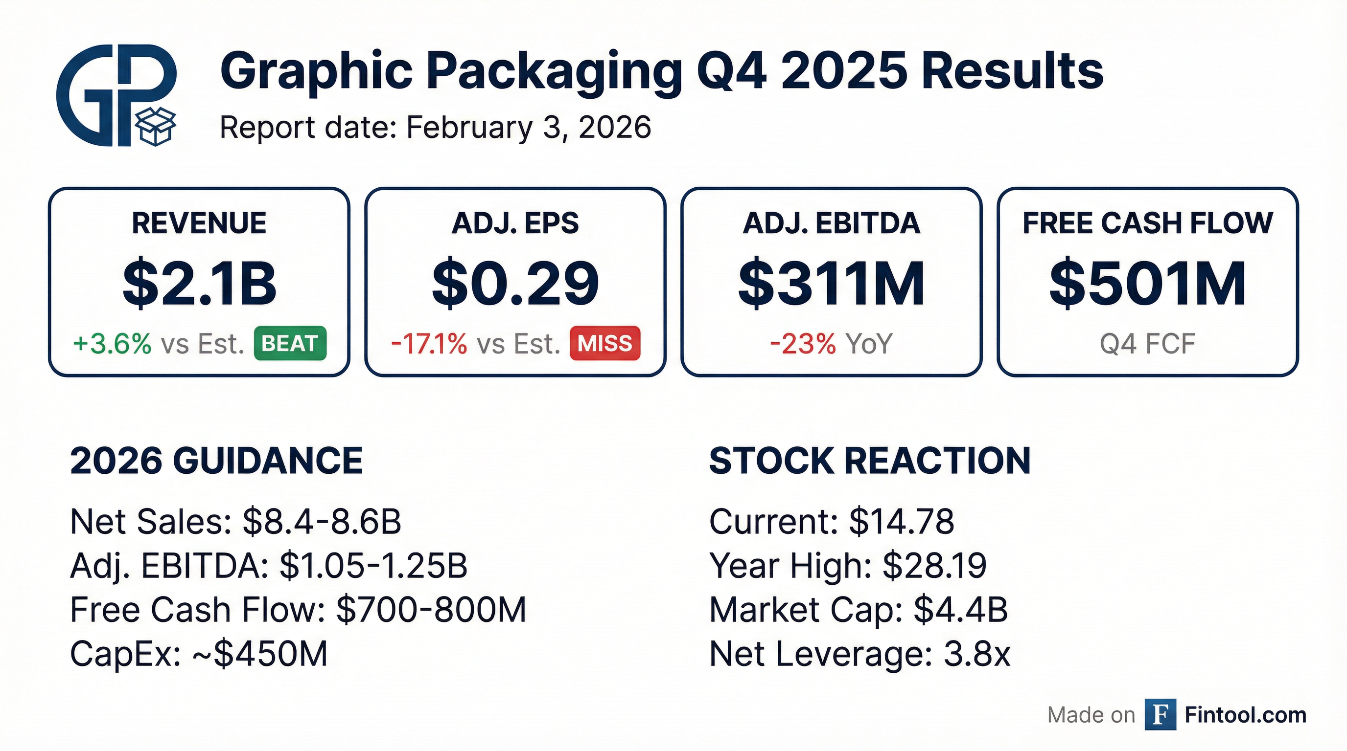 - Graphic Packaging reported Q4 2025 net sales of $2.1 billion, which were flat year-over-year, and Adjusted EBITDA of $311 million. For the full year 2025, net sales were $8.6 billion, down approximately 2%, Adjusted EBITDA was approximately $1.4 billion, and Adjusted EPS was $1.80, with net leverage ending at 3.8x.