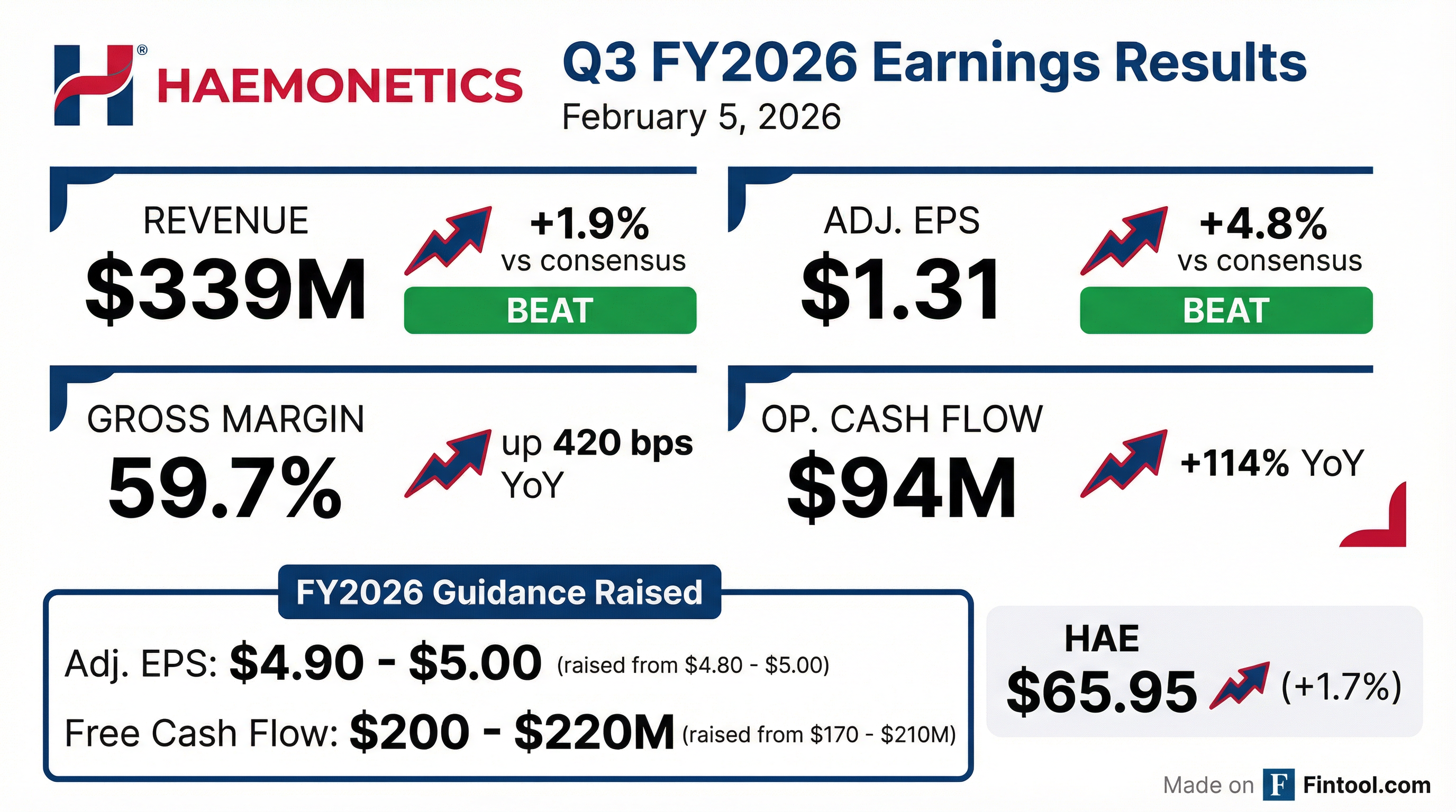- Haemonetics (HAE) reported Q3 Fiscal 2026 adjusted EPS of $1.31, a 10% increase year-over-year, with an adjusted operating margin of 26.3%.
