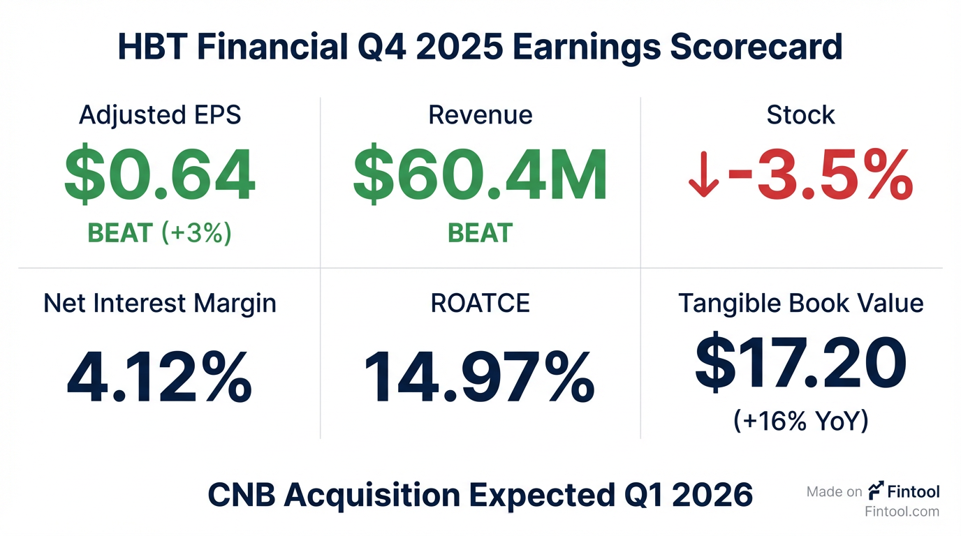 - HBT Financial reported net income of $18.9 million, or $0.60 diluted earnings per share, for the fourth quarter of 2025, compared to $19.8 million (or $0.63 diluted EPS) in Q3 2025 and $20.3 million (or $0.64 diluted EPS) in Q4 2024. Adjusted net income for Q4 2025 was $20.1 million, or $0.64 adjusted diluted earnings per share, compared to $20.5 million (or $0.65 adjusted diluted EPS) in Q3 2025 and $19.5 million (or $0.62 adjusted diluted EPS) in Q4 2024.