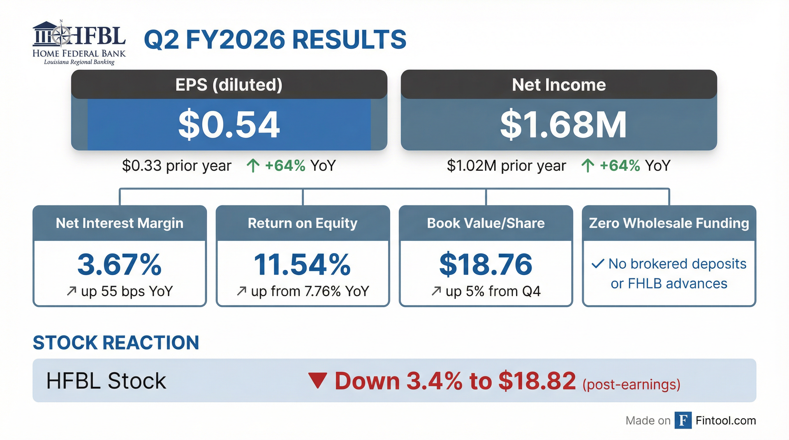 - Home Federal Bancorp, Inc. of Louisiana reported net income of $1.675 million for the three months ended December 31, 2025, with basic earnings per share of $0.55, compared to $1.020 million and $0.33, respectively, for the same period in 2024. For the six months ended December 31, 2025, net income was $3.274 million and basic EPS was $1.09.
