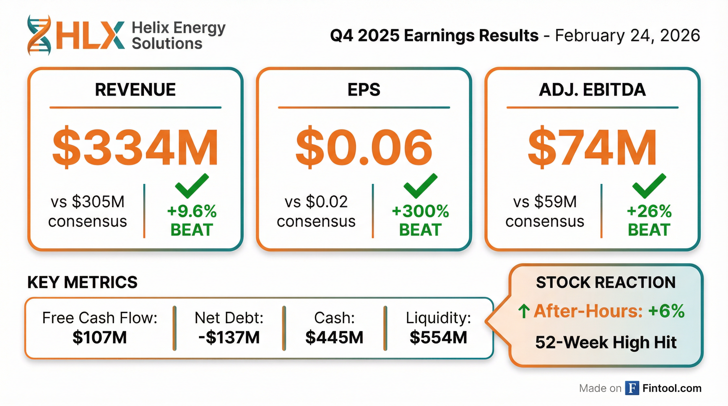 - Helix Energy Solutions Group reported Q4 2025 revenues of $334 million and full-year 2025 revenues of $1.3 billion, with Adjusted EBITDA of $74 million and $272 million respectively, and strong positive free cash flow for both periods. The company ended the year with $445 million in cash and cash equivalents.