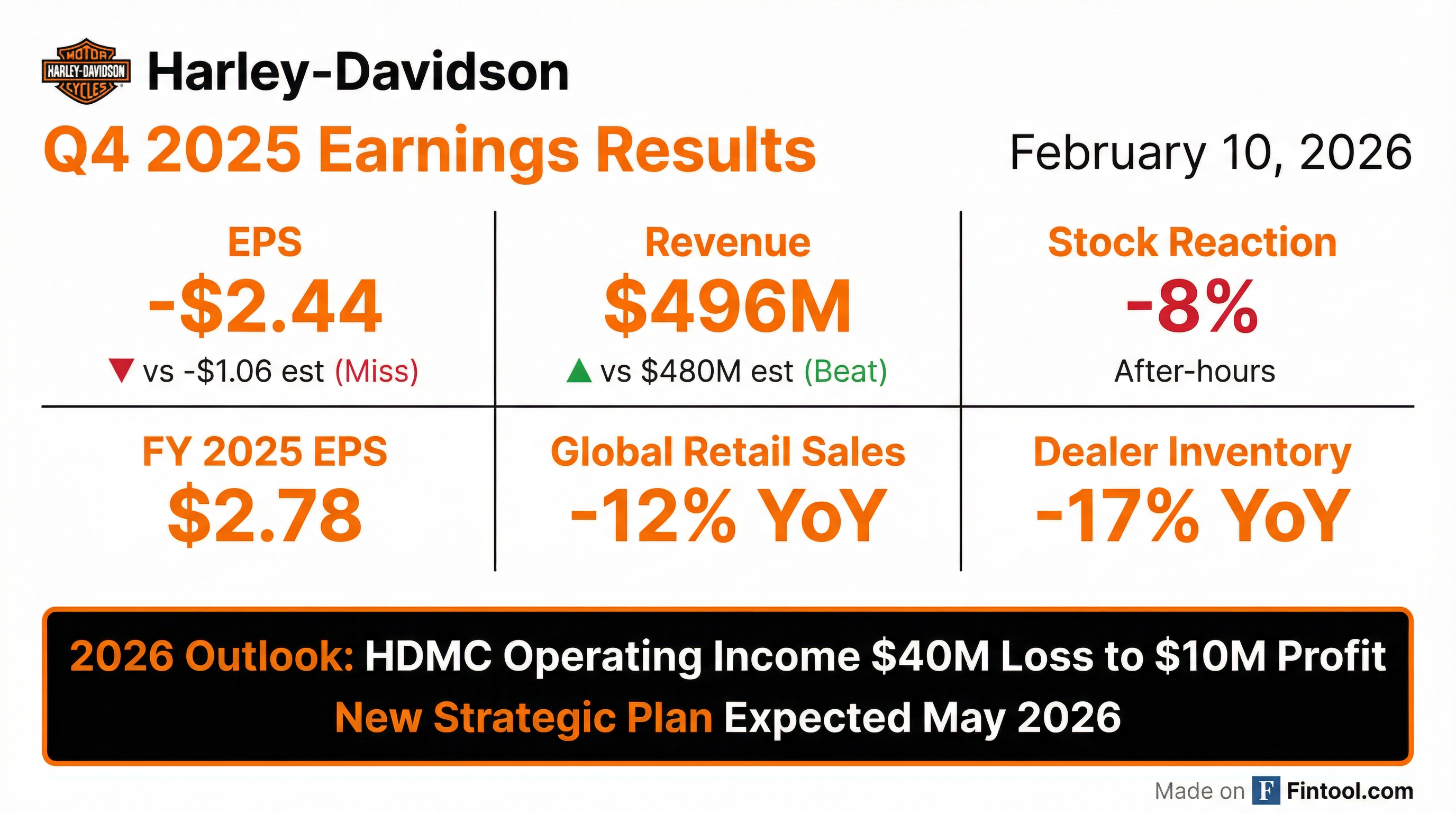 - Harley-Davidson reported a challenging Q4 and full year 2025, with consolidated revenue down 28% and 14% respectively, and a Q4 EPS loss of $2.44.