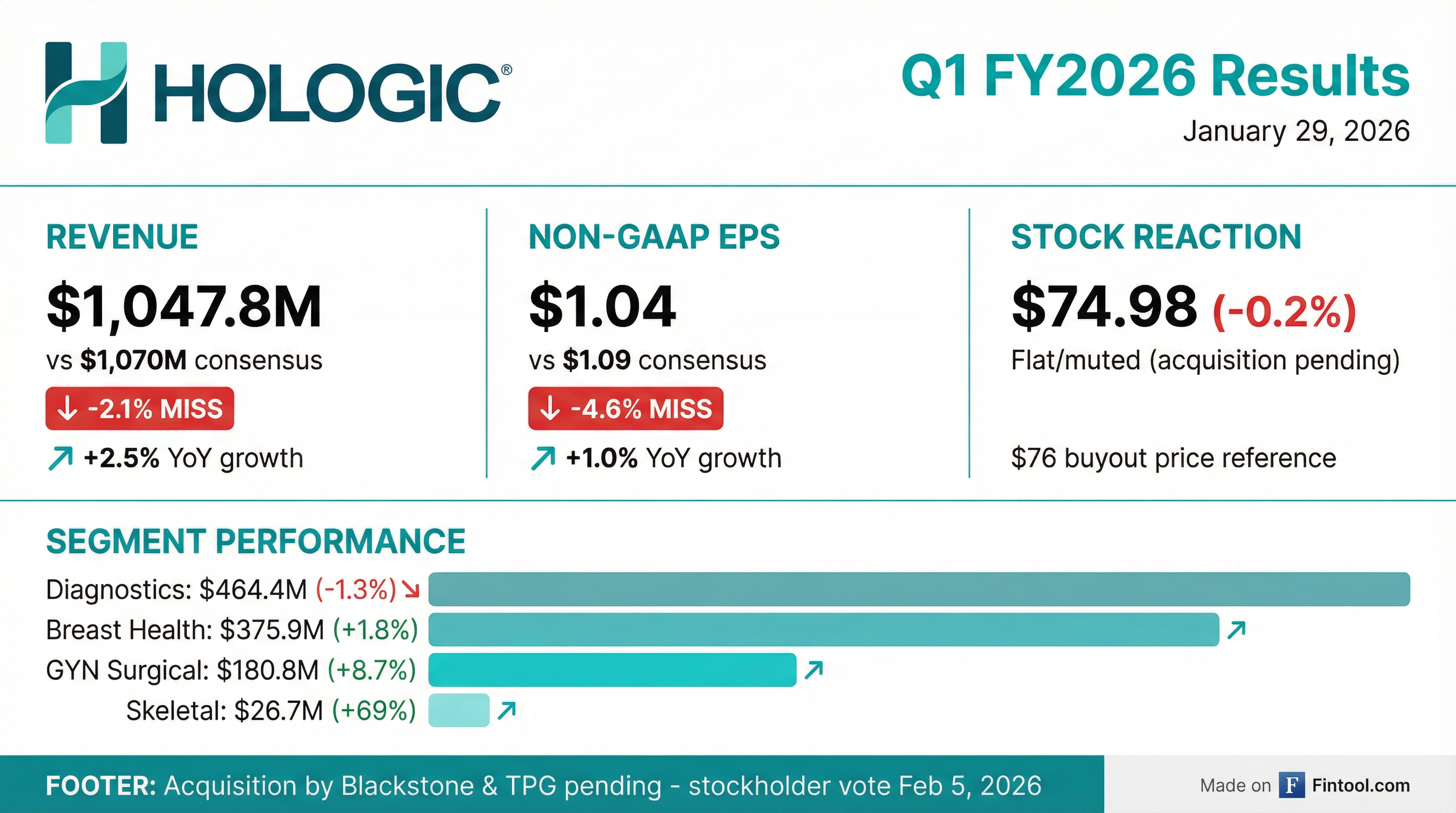 - Hologic reported revenue of $1,047.8 million, up 2.5% year-over-year for Q1 FY2026.