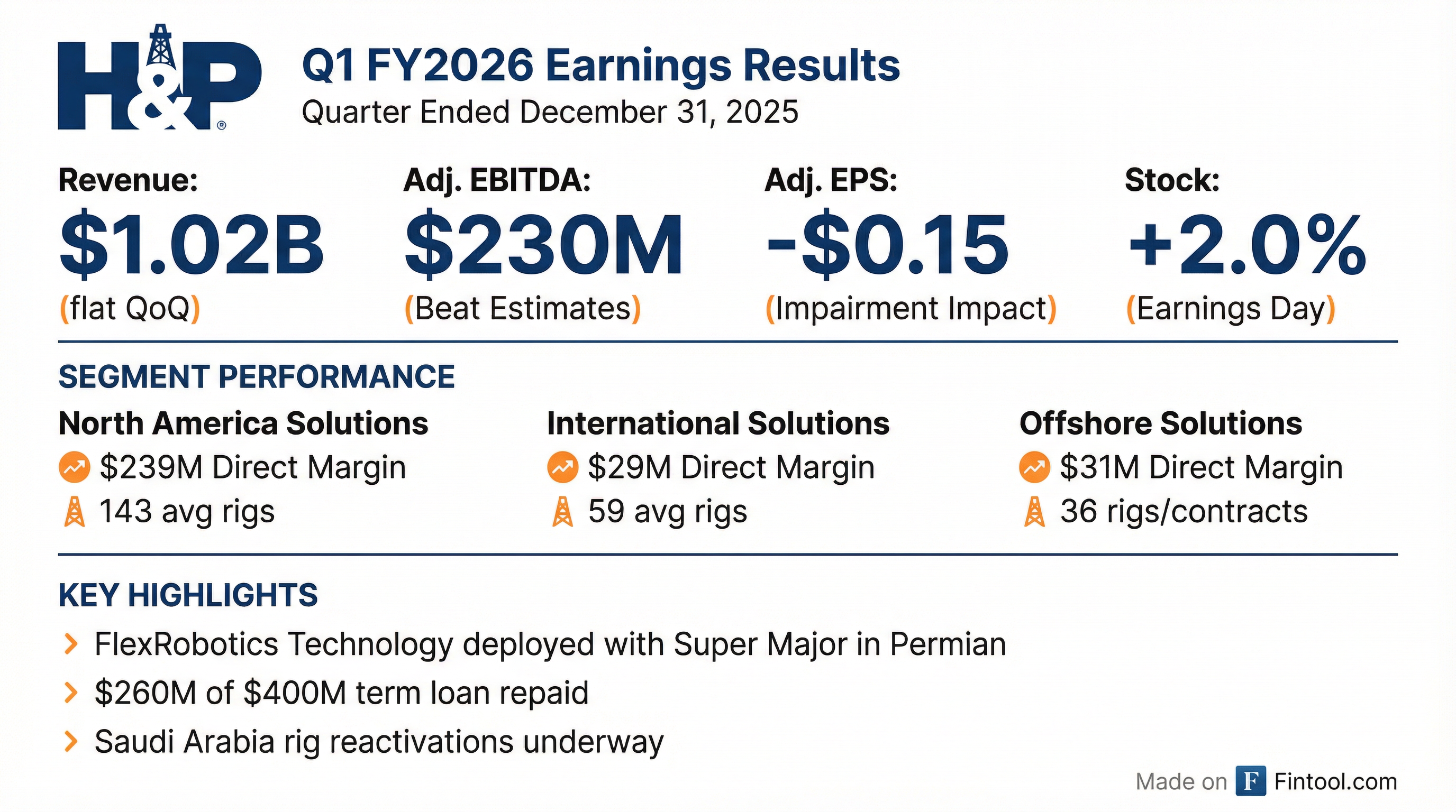 - Operationally, H&P announced the reactivation of seven suspended rigs in Saudi Arabia and expects its International Solutions segment to average between 56-68 rigs for fiscal 2026.