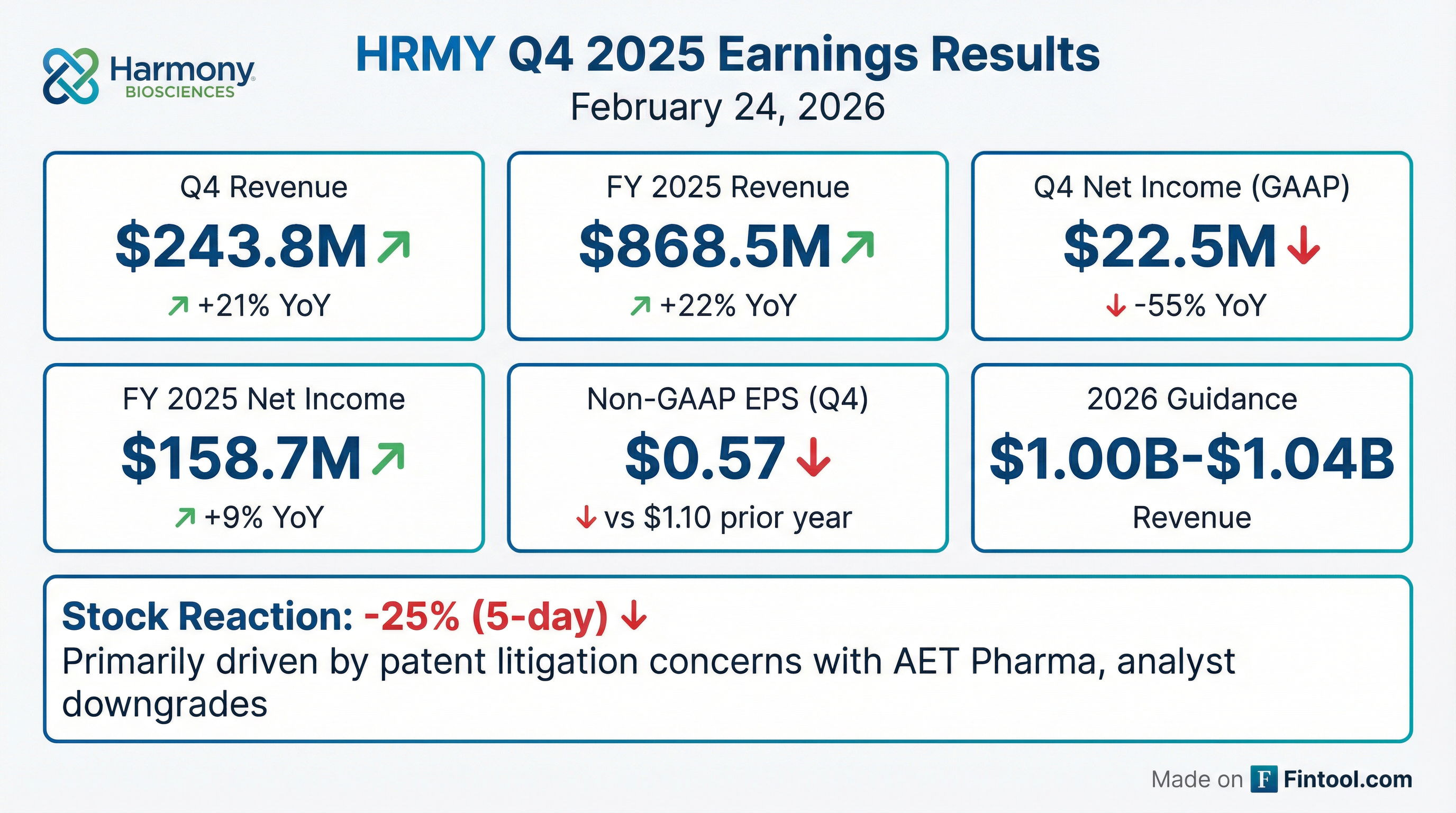 - Harmony Biosciences Holdings reported net product revenue of $243.8 million for Q4 2025, an increase of 21% compared to Q4 2024, and $868.5 million for the full year 2025, up 22% from FY 2024.