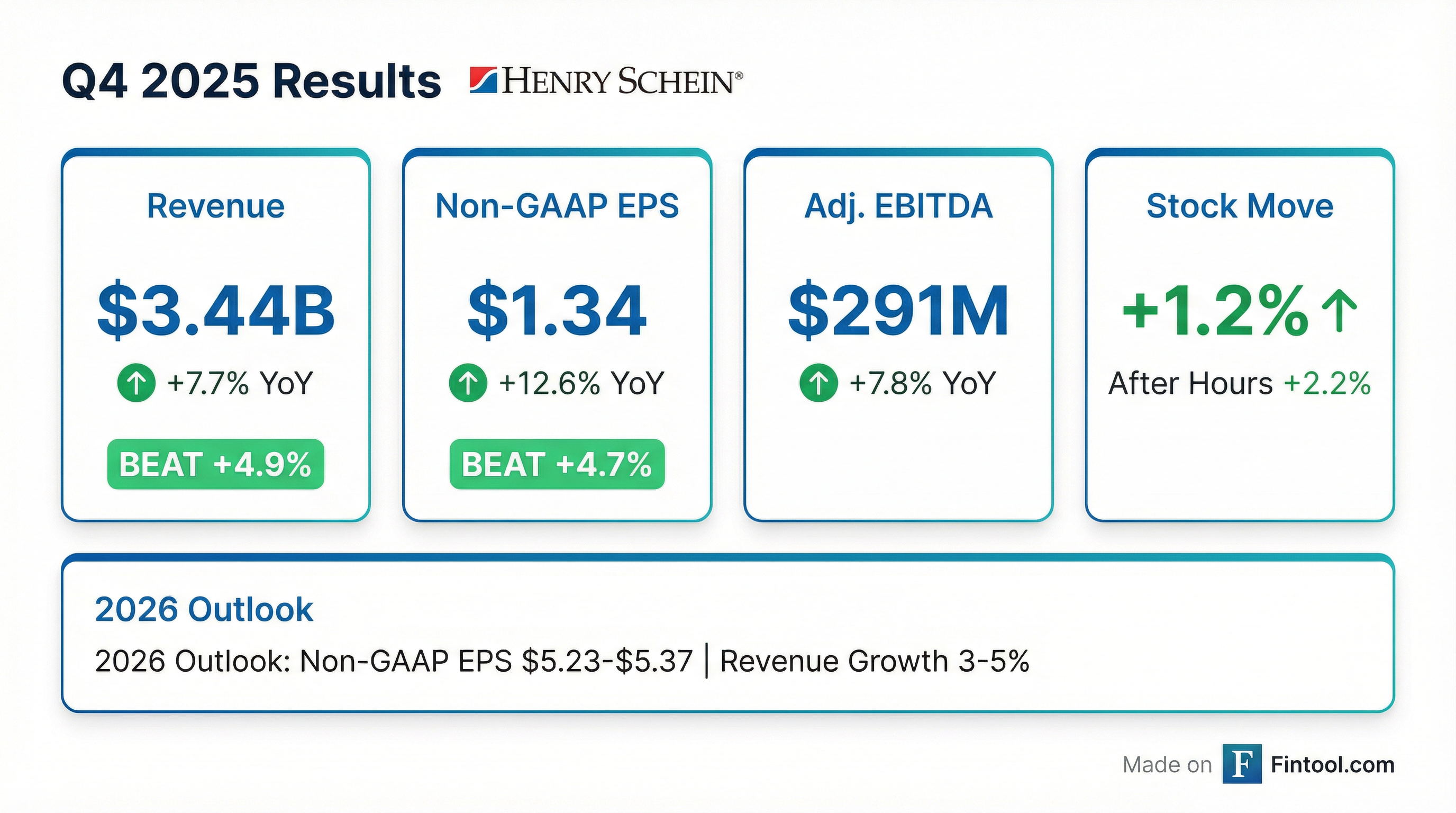 - Henry Schein delivered $3.4 billion in Q4 sales, up 7.7% year-over-year (constant currency +5.8%), led by distribution, equipment, specialty products, and technology businesses.