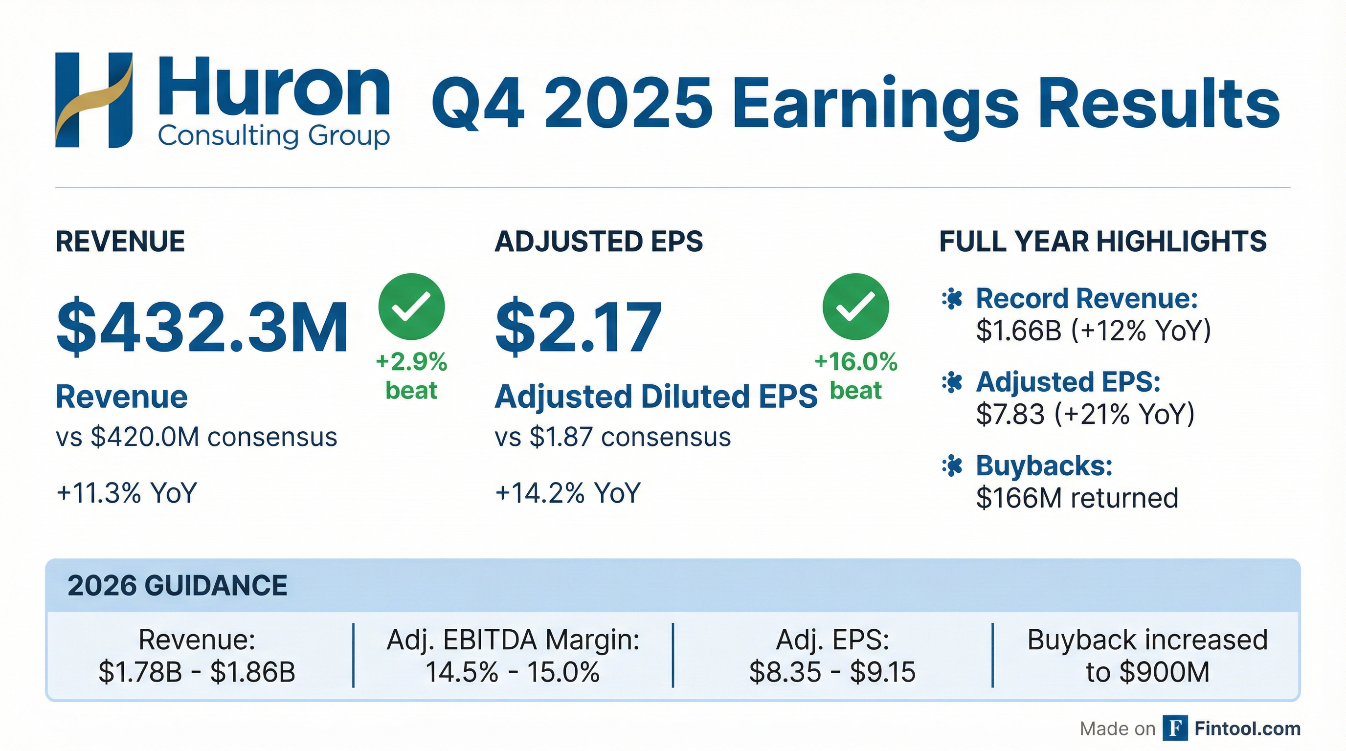 - Huron reported revenues before reimbursable expenses of $432.3 million for Q4 2025, an 11.3% increase from Q4 2024, and $1.66 billion for full year 2025, an 11.9% increase over 2024.