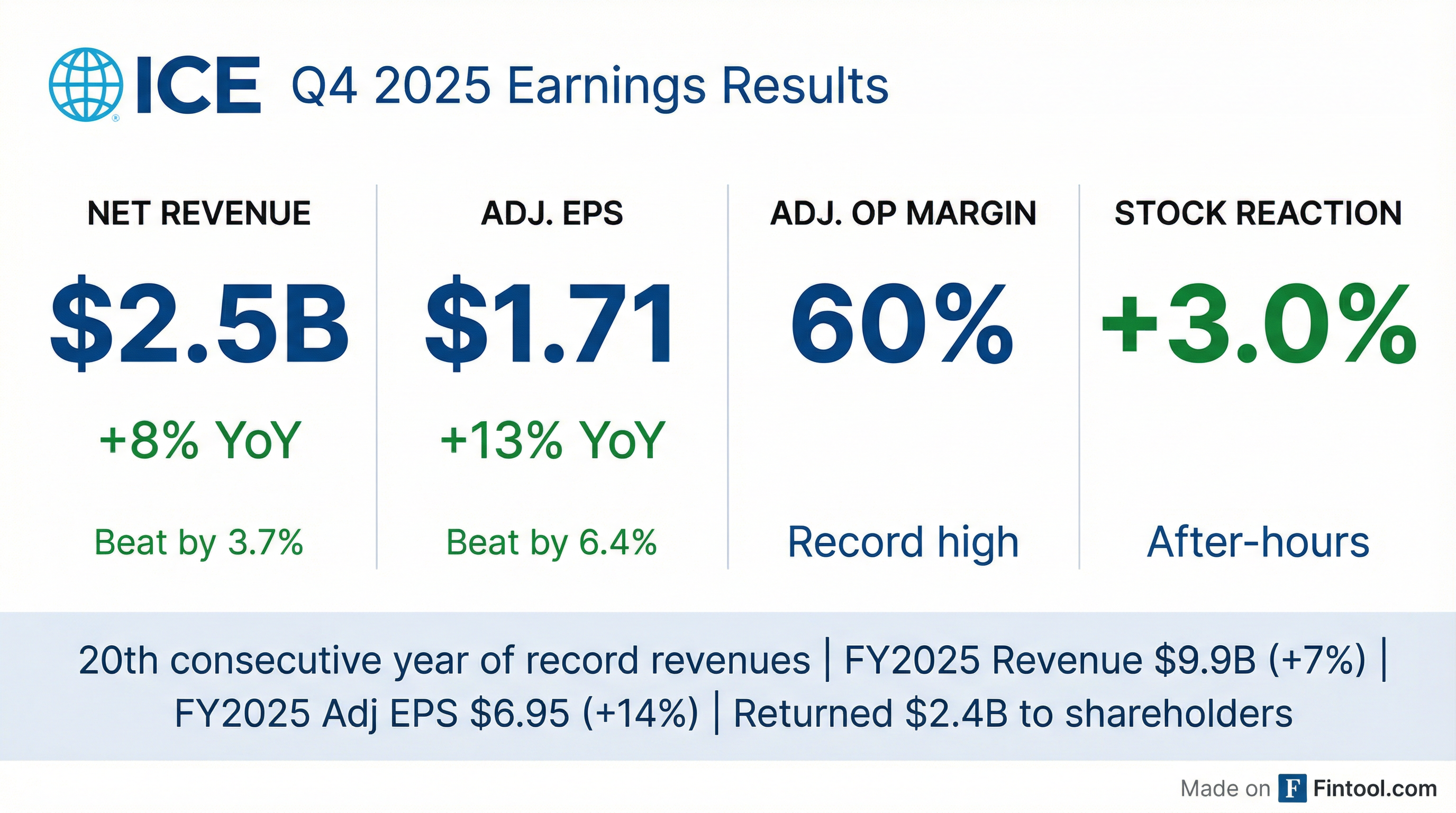 - For full-year 2025, ICE generated adjusted free cash flow of $4,187 million (+16%) and returned $2.4 billion to shareholders—including ~$1.3 billion in share repurchases—while ending the year with ~3.0x leverage.