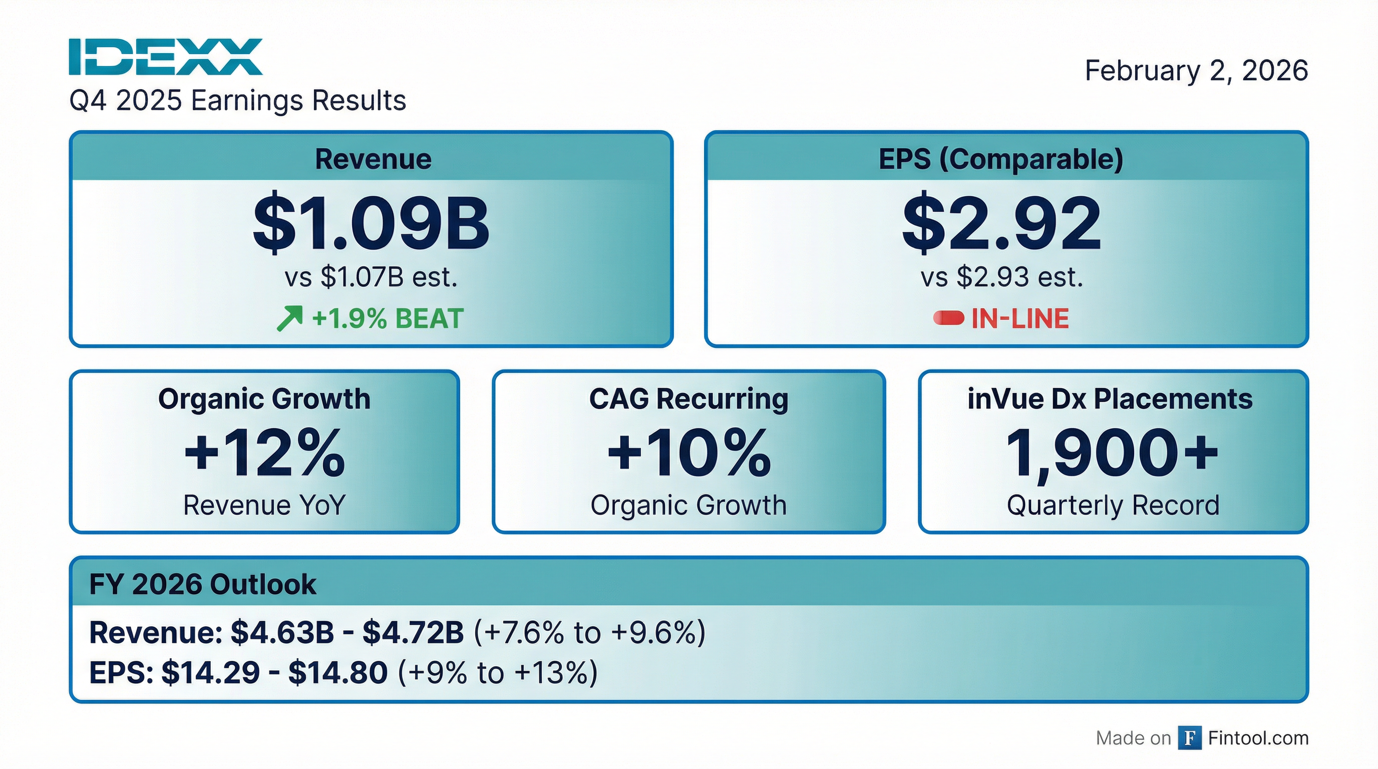 - IDEXX delivered Q4 revenue of $1,091 million, up 14% reported and 12% organic, driven by CAG Diagnostics recurring revenue growth of 12% reported and 10% organic.