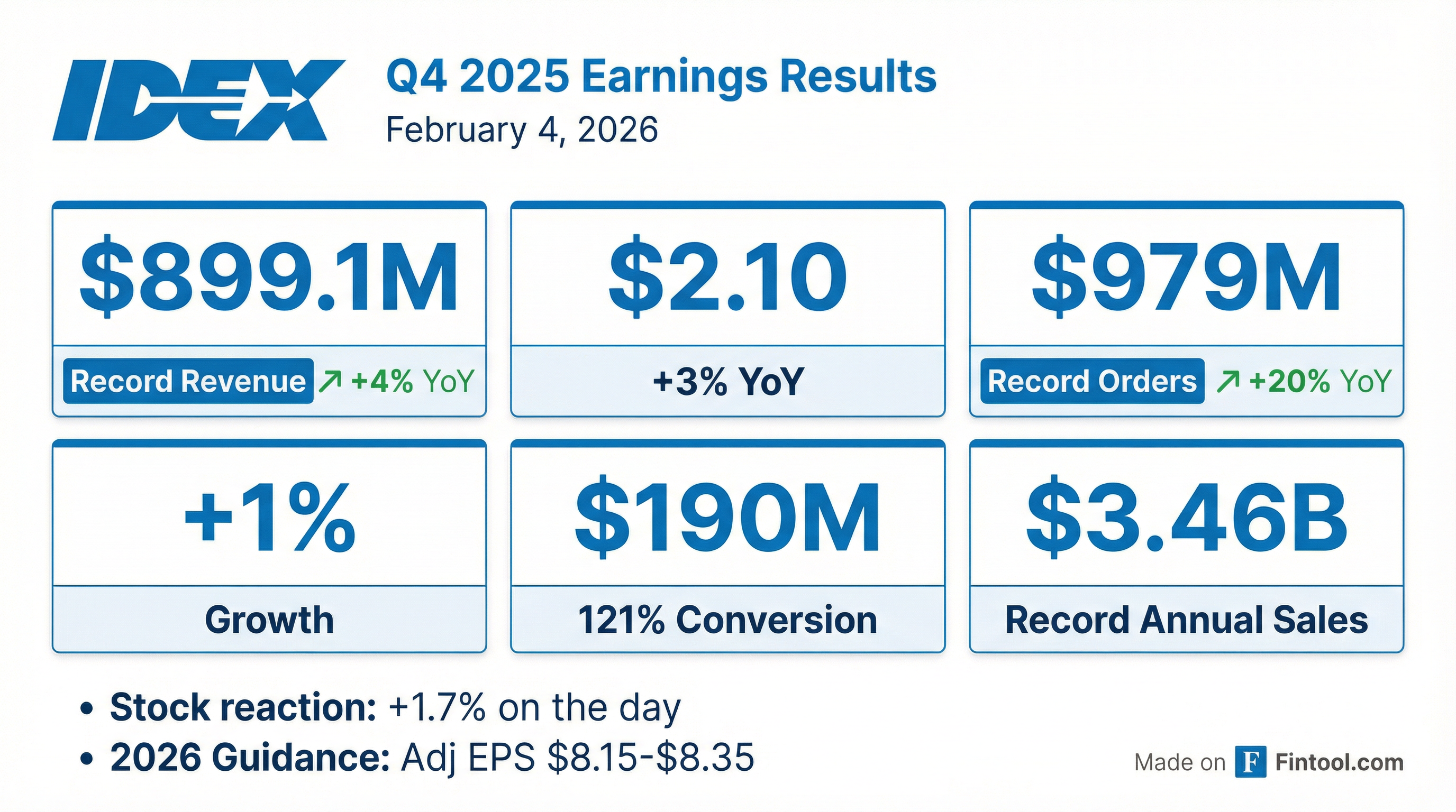 - IDEX delivered record Q4 sales of $899.1 million (+4% reported, +1% organic) and record orders of $979.2 million (+20% reported, +16% organic).