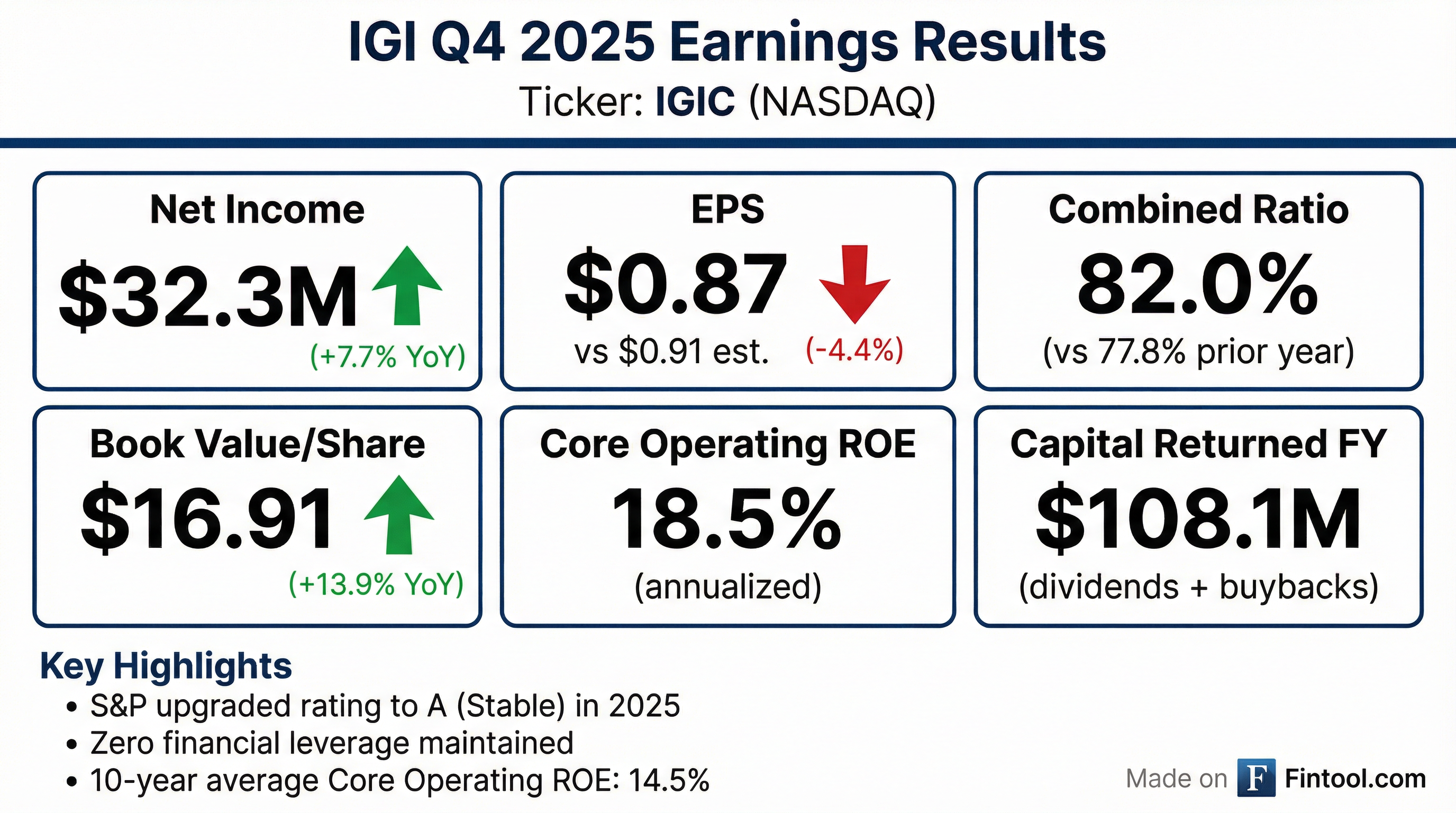 - For the full year 2025, IGIC returned $108.1 million to shareholders, comprising $46.2 million in common share dividends (including a $0.85 special dividend) and $61.9 million in share repurchases. The quarterly common share dividend was also increased to $0.05 in 2025.