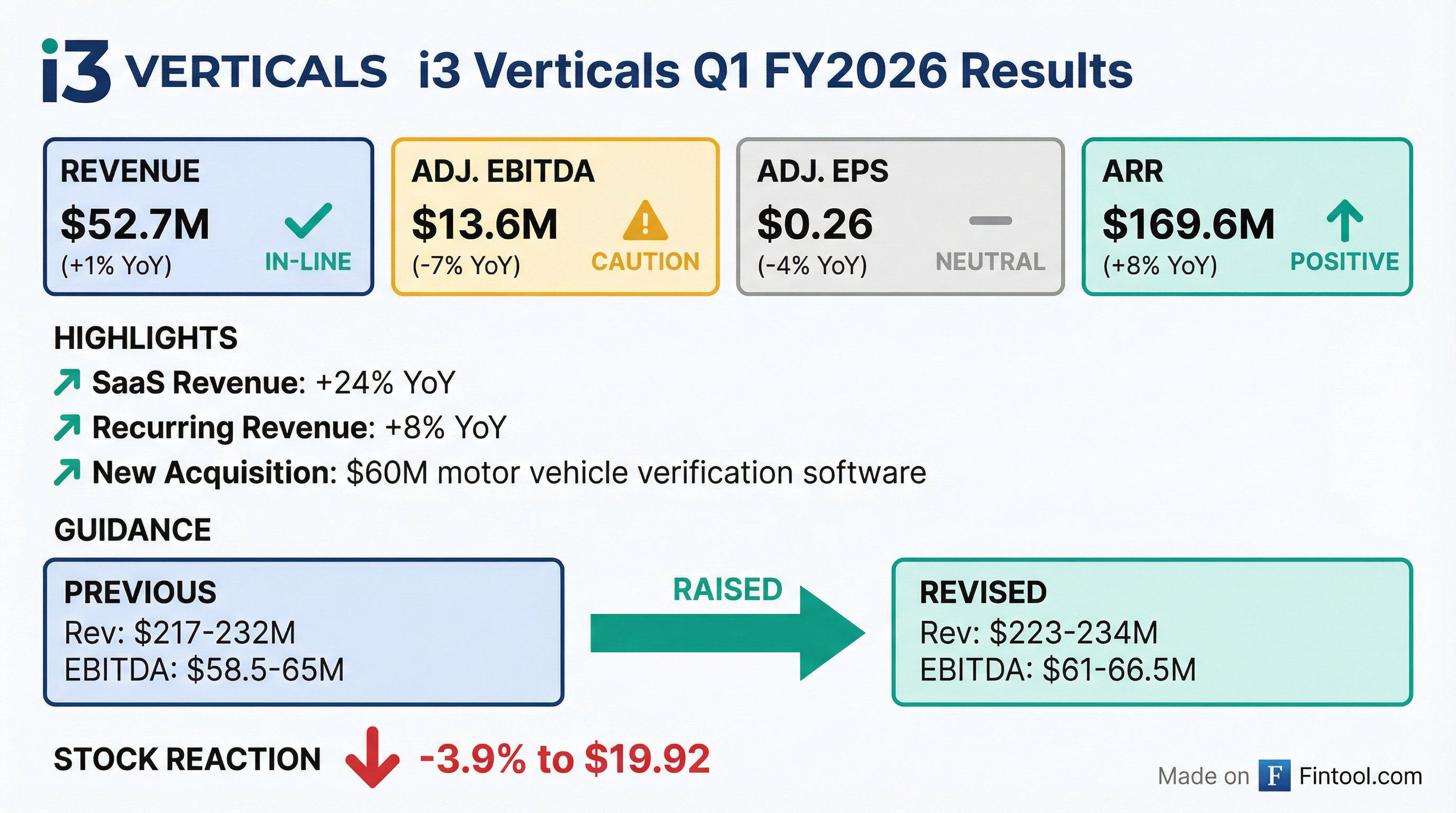 - i3 Verticals reported Q1 2026 revenue of $52.7 million, a 1% increase year-over-year, with recurring revenue up 8% to $169.6 million and SaaS revenue growing over 24%. Adjusted EBITDA for the quarter declined $1 million to $13.6 million, and adjusted diluted earnings per share was $0.26.