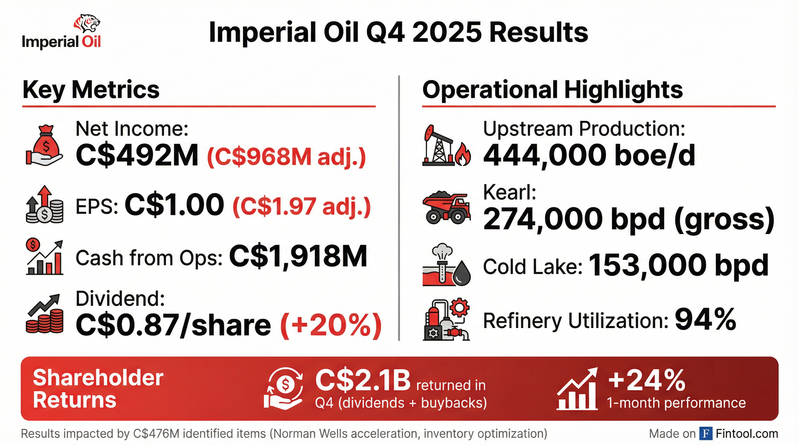 - Net income for Q4 2025 was $492 million, which included one-time after-tax charges totaling CAD 476 million (CAD 320 million for the cessation of production at Norman Wells and CAD 156 million for inventory optimization). Excluding these identified items, net income was $968 million.