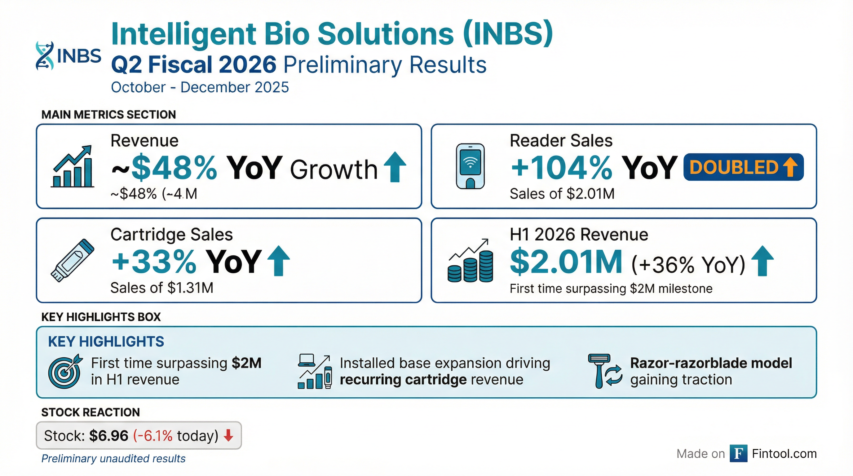 - Intelligent Bio Solutions Inc. (INBS) expects fiscal second quarter 2026 revenue to increase approximately 48% year-over-year, contributing to an anticipated $2.01 million in total revenue for the first half of fiscal year 2026, a 36% year-over-year increase.