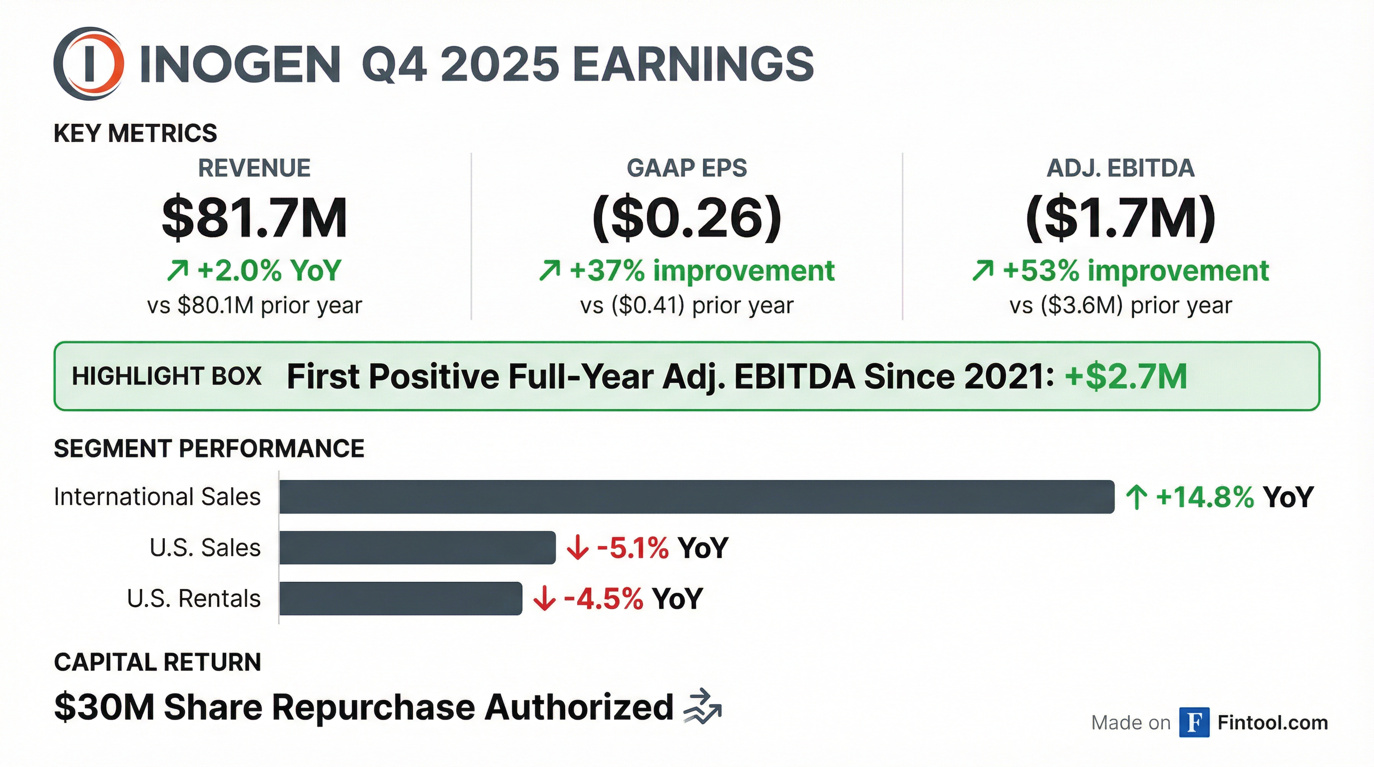 - Inogen reported $348.7 million in total revenue for full year 2025, a 4% year-over-year increase, and $81.7 million for Q4 2025, up 2%. The company achieved positive adjusted EBITDA of $2.7 million for the full year 2025, marking its first positive adjusted EBITDA year since 2021.