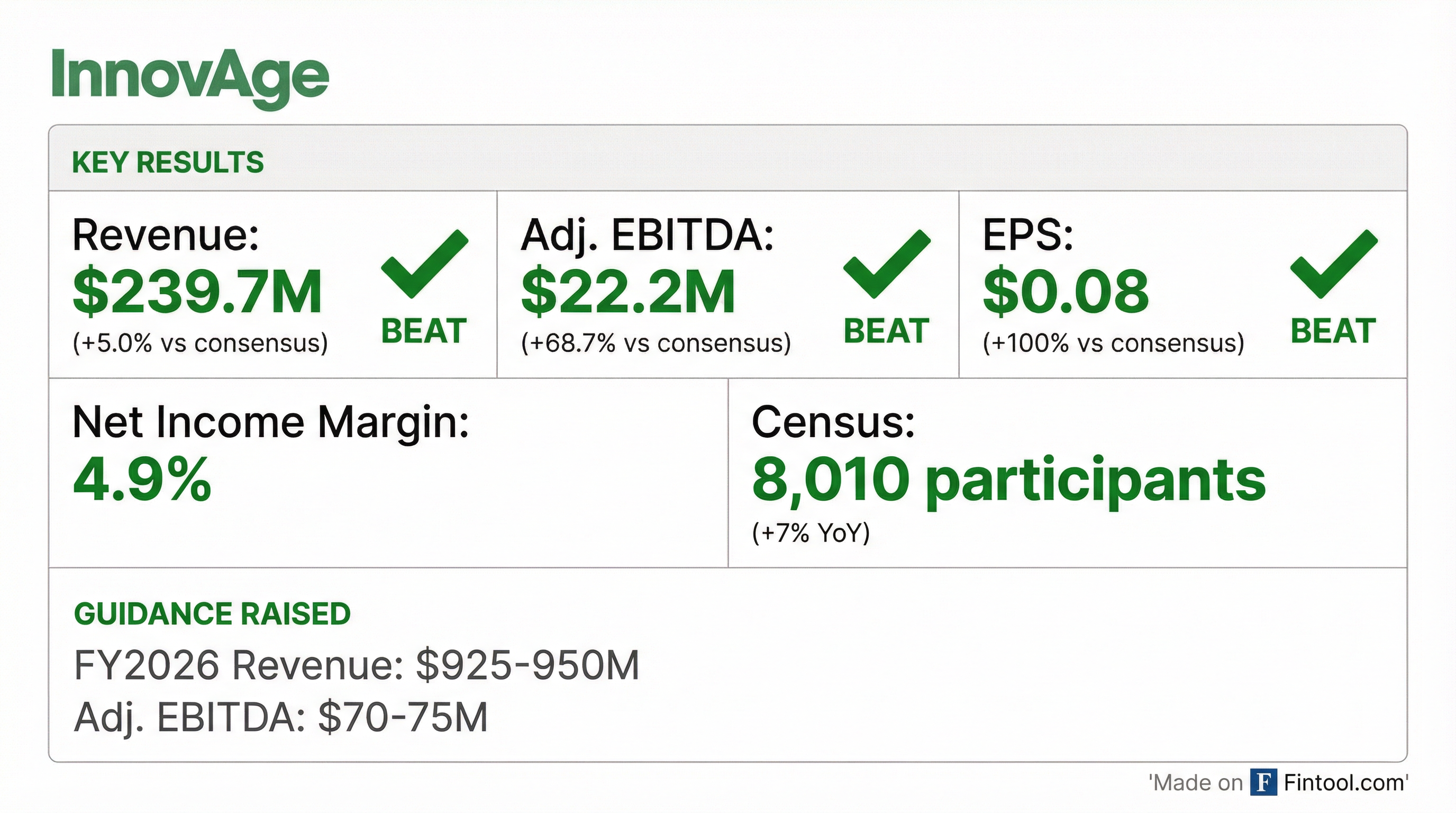 - For the second quarter of fiscal year 2026, InnovAge reported total revenues of $239.7 million, Adjusted EBITDA of $22.2 million, and net income of $11.8 million. The company achieved an Adjusted EBITDA margin of 9.2%, exceeding its intermediate-term target for the first time.