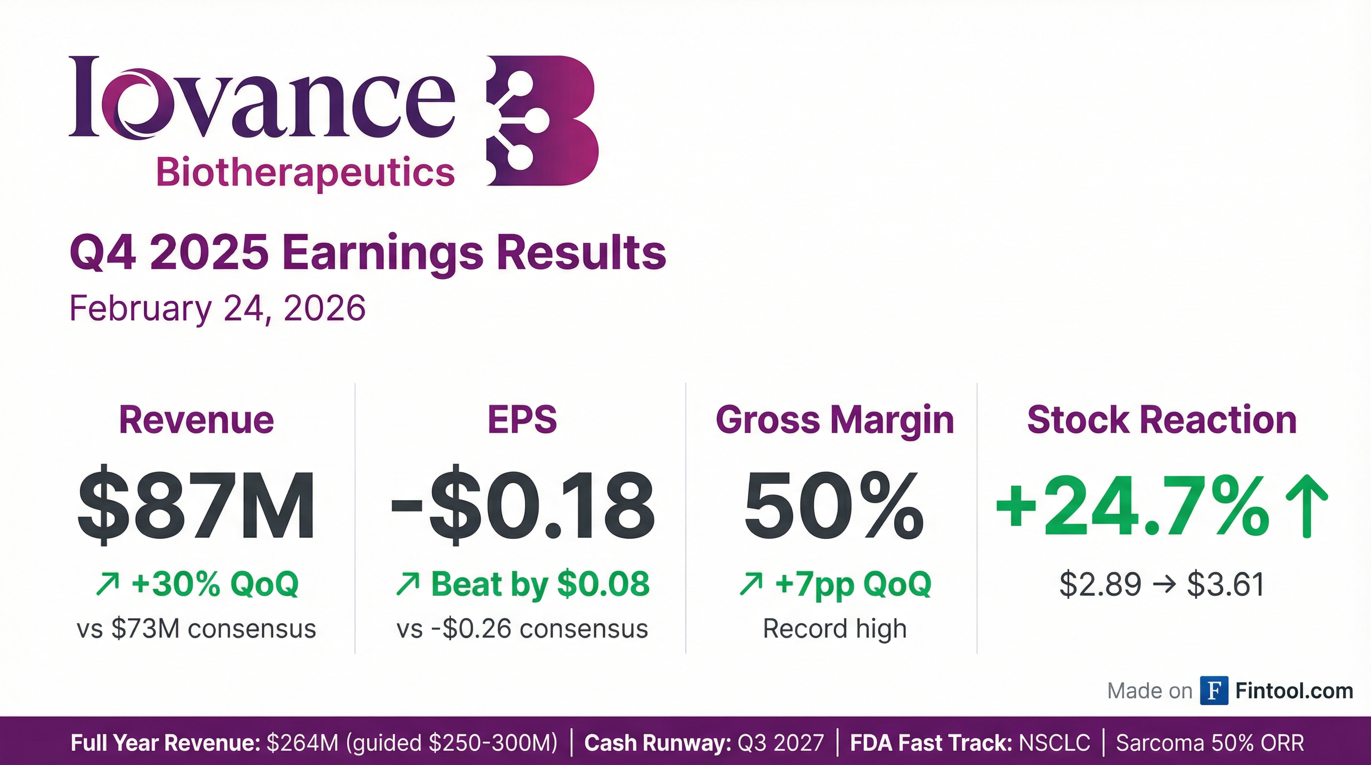 - Iovance Biotherapeutics reported total revenue of $264 million for the full year 2025, within guidance, with Q4 2025 product revenue at $87 million, marking approximately 30% growth from the prior quarter, primarily driven by AMTAGVI. The company also achieved a 50% gross margin from cost of sales in Q4 2025 and extended its cash runway into Q3 2027 with approximately $303 million cash at year-end 2025.