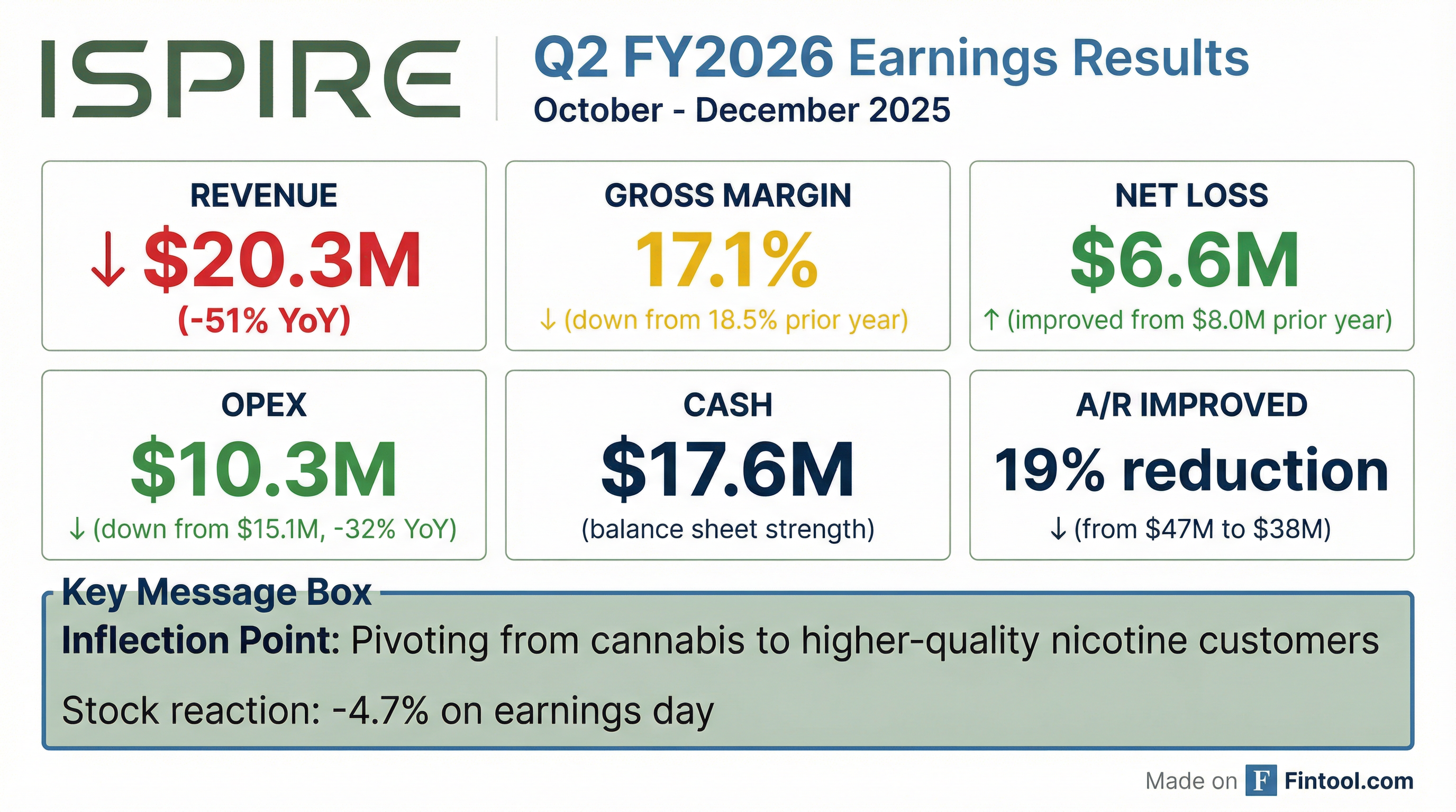 - Ispire Technology reported Q2 2026 revenue of $20.3 million, a decrease from $41.8 million in Q2 2025, attributed to a strategic realignment towards higher-quality nicotine customers and away from lower-value cannabis clients.