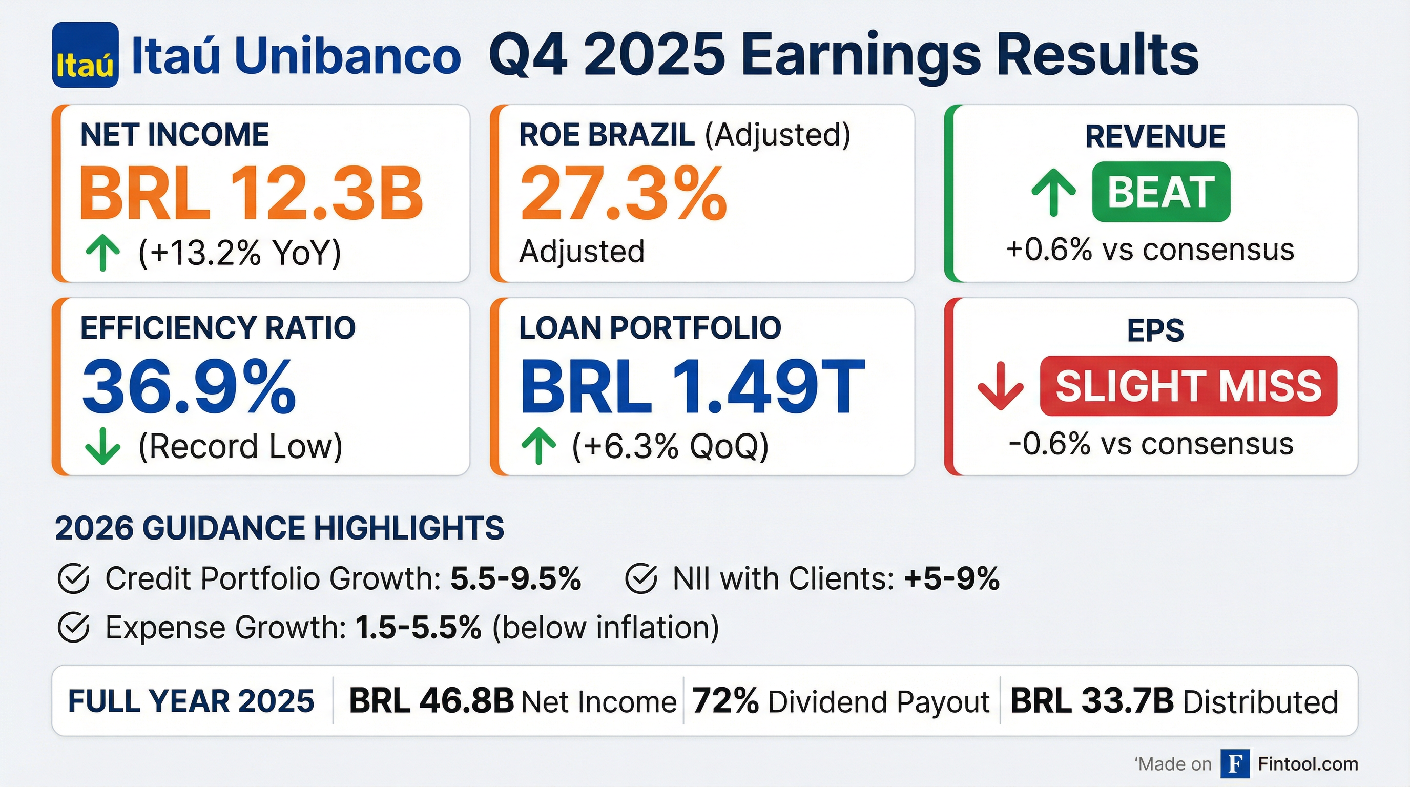 - Itaú Unibanco reported a net income of BRL 12.3 billion for Q4 2025, representing a 13.2% year-over-year increase, with a consolidated ROE of 24.4%.