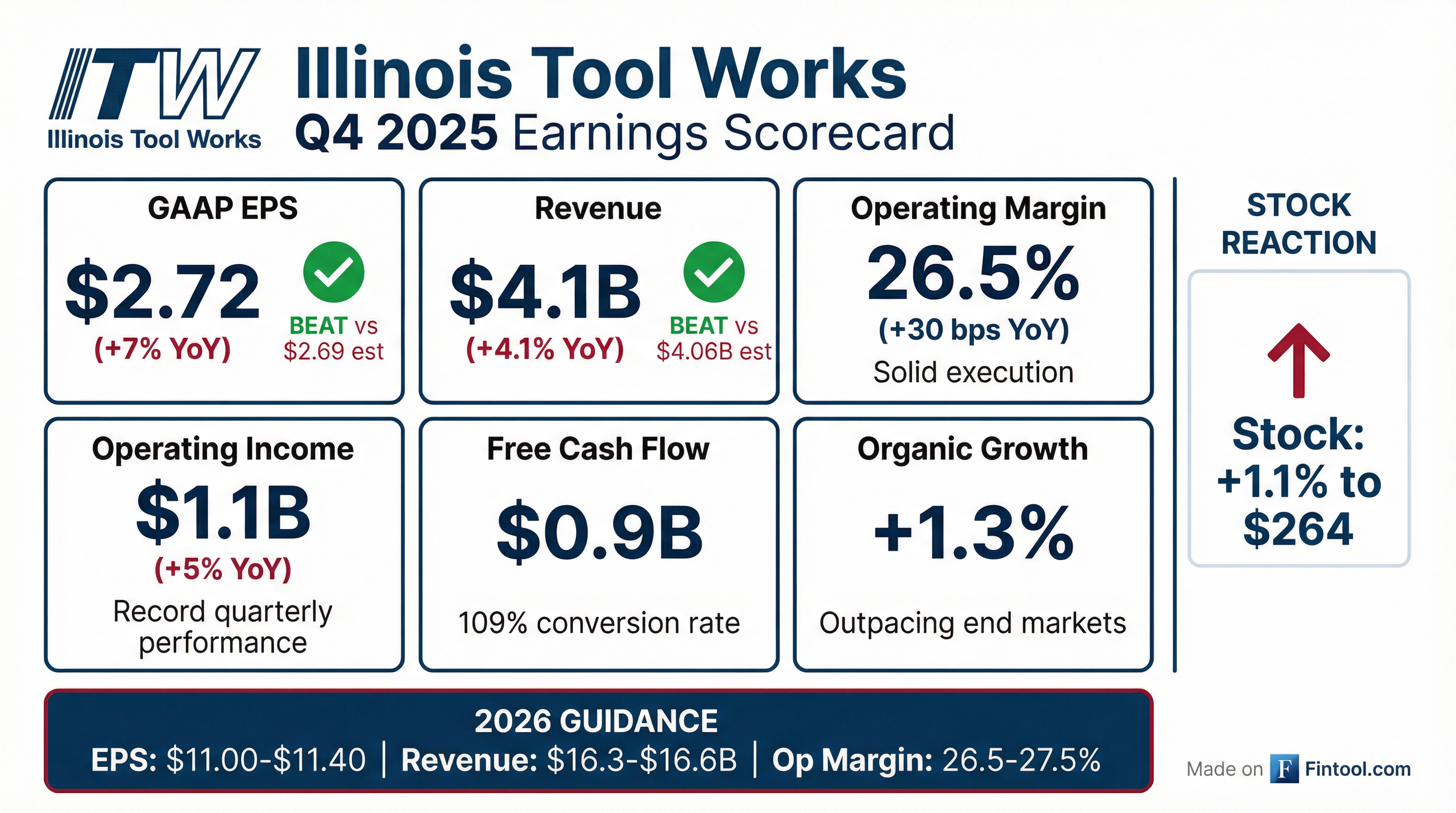 • For FY 2026, ITW guides to 1%–3% organic growth (2%–4% total), $11.20 EPS midpoint (+7%), and ~100 bps operating margin expansion to 26.5%–27.5%; free cash flow conversion is expected to exceed 100%.