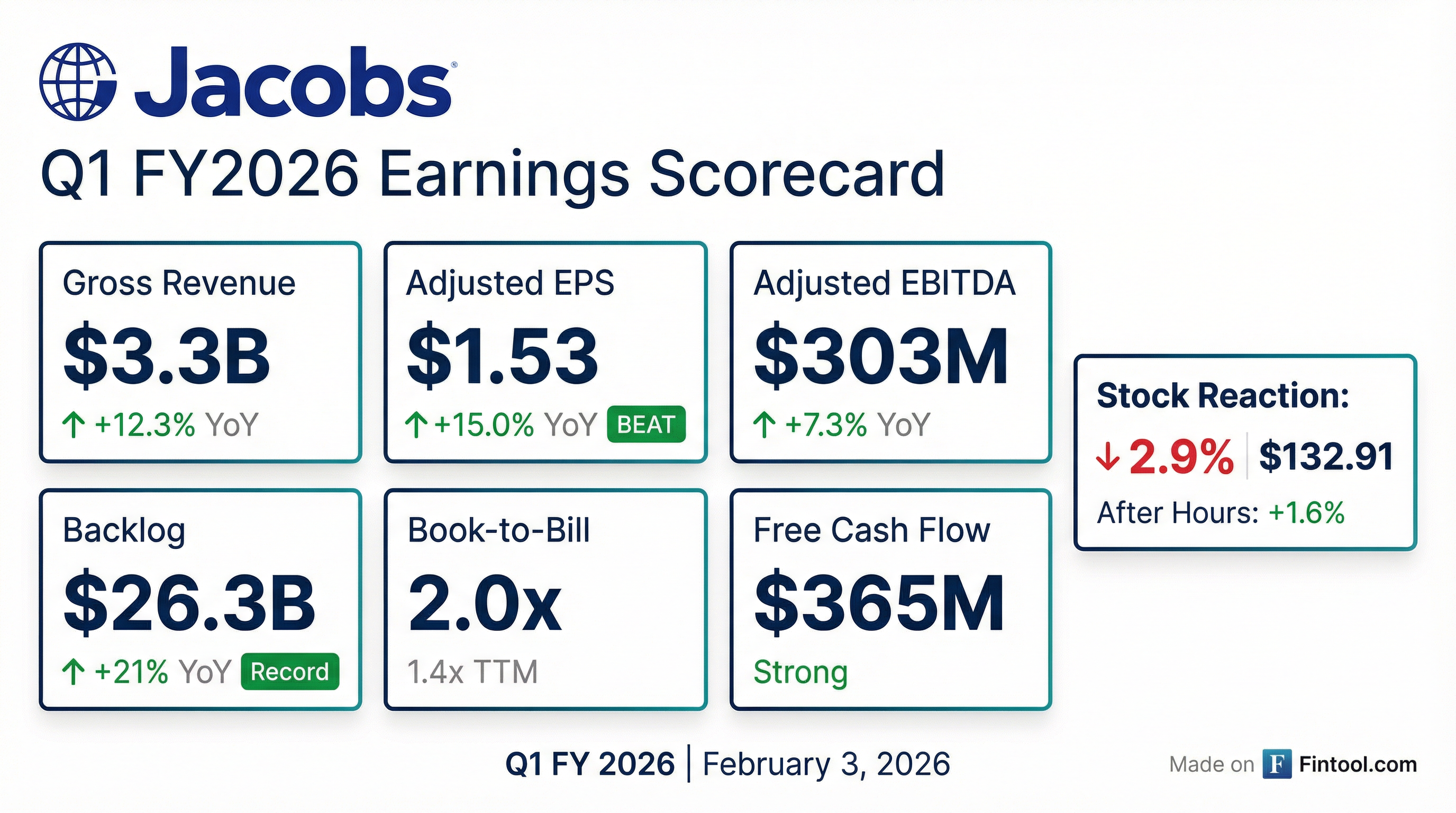 - Jacobs reported Q1 FY2026 gross revenue of $3.3 billion (+12.3% y/y) and adjusted net revenue of $2.3 billion (+8.2% y/y).