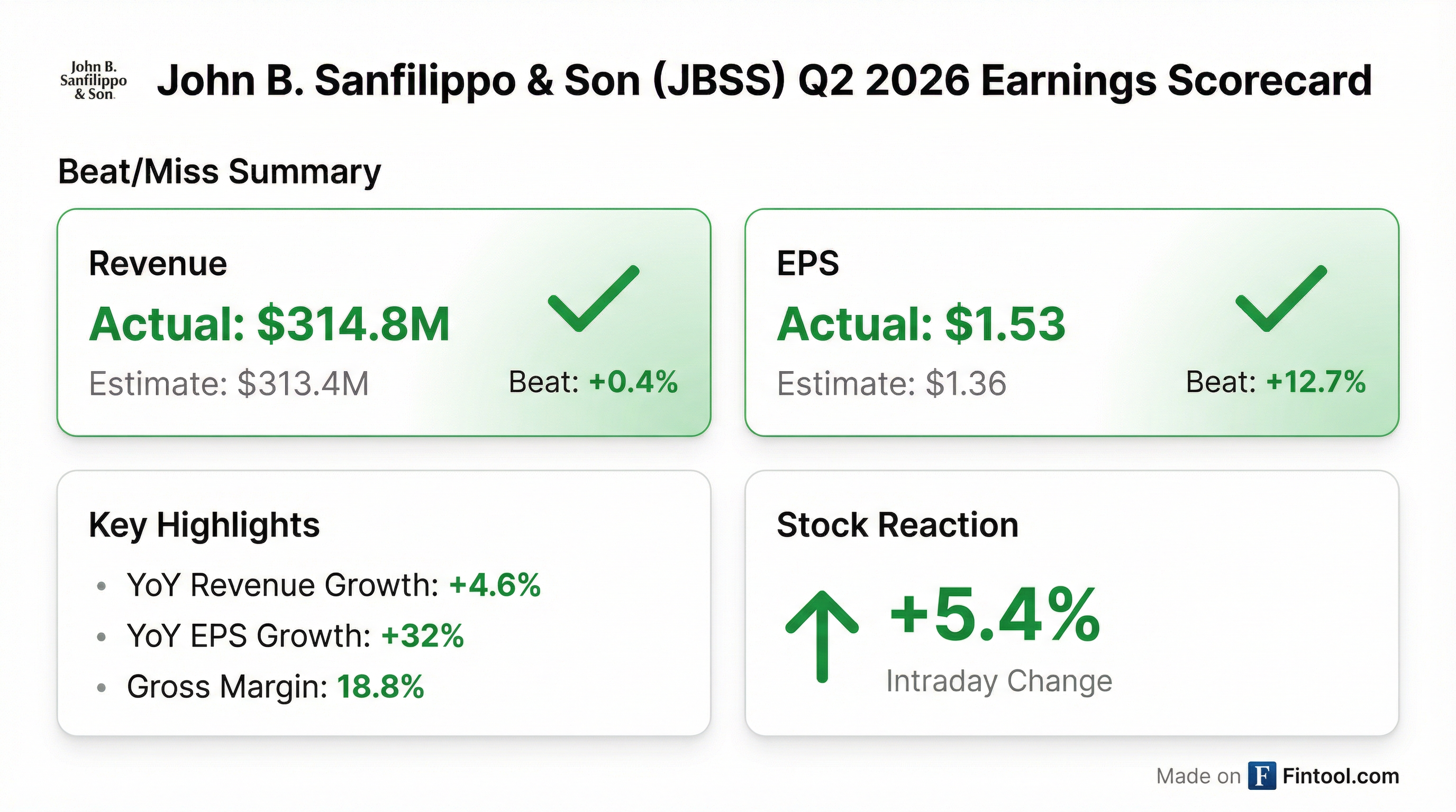 - John B. Sanfilippo and Son (JBSS) reported a 32% increase in diluted earnings per share to $1.53 for Q2 fiscal 2026, with net sales rising 4.6% to $314.8 million compared to Q2 fiscal 2025.