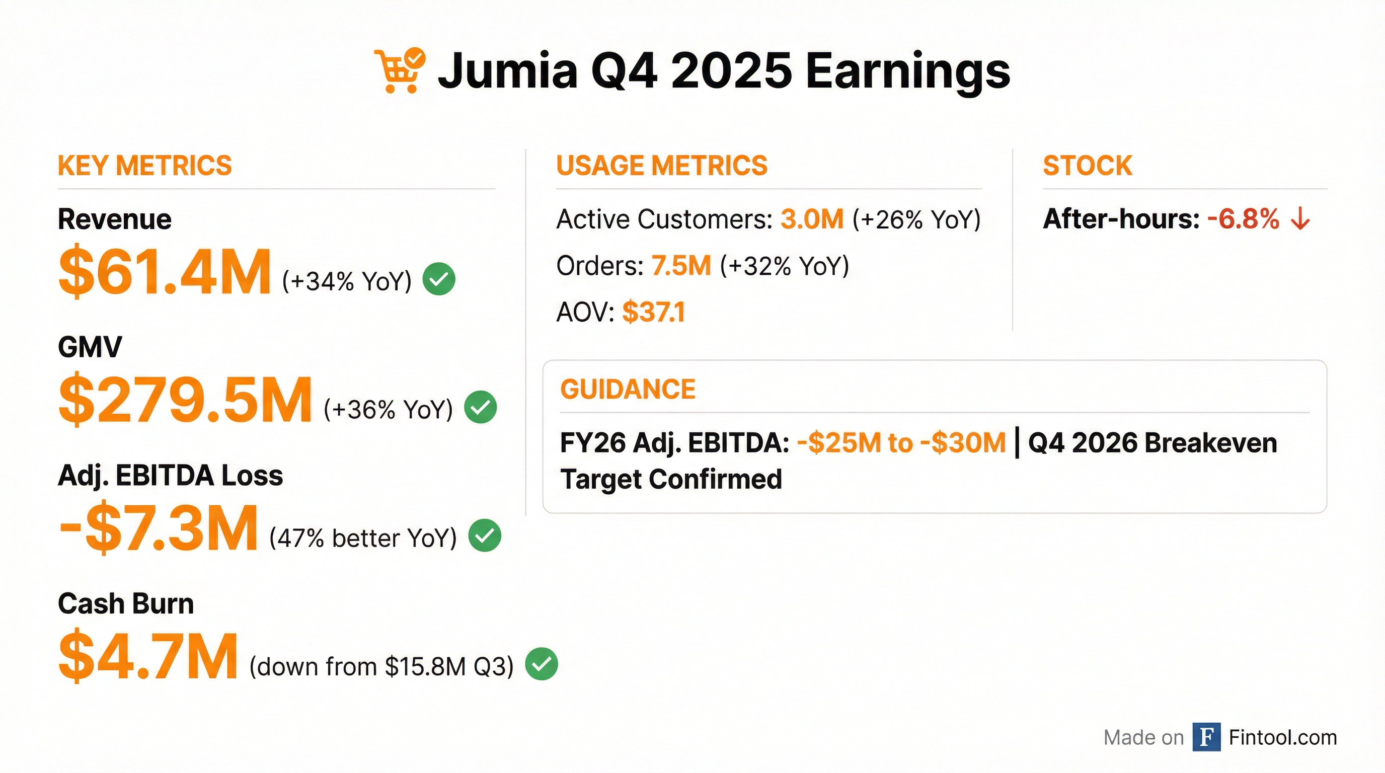 - Jumia provided FY 2026 guidance, projecting GMV growth between 27% and 32% year-over-year and an Adjusted EBITDA loss between $25 million and $30 million.