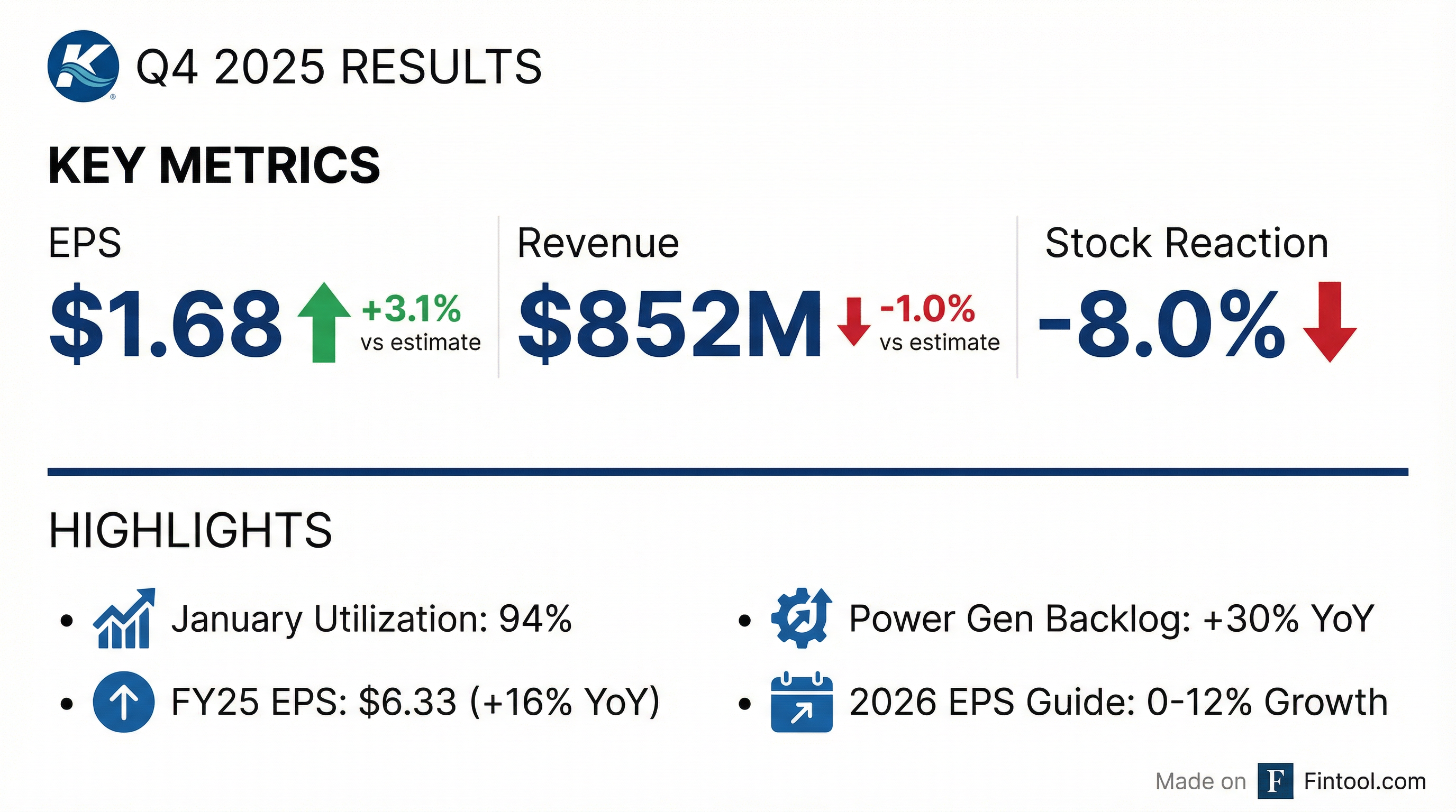 - Kirby (KEX) reported Q4 2025 revenues of $851.8 million and diluted earnings per share of $1.68, marking a 6% year-over-year increase in revenue and a 127% increase in EPS. For the full year 2025, revenues reached $3,364.1 million and EPS was $6.33.