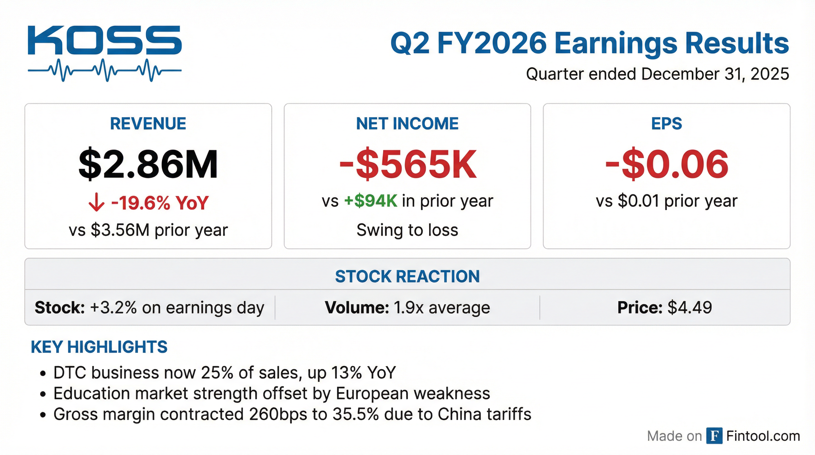 • Koss Corporation reported a net loss of $565,407 for the second quarter ended December 31, 2025, with net sales decreasing by 19.6% to $2,861,379 compared to the same quarter in the prior year.