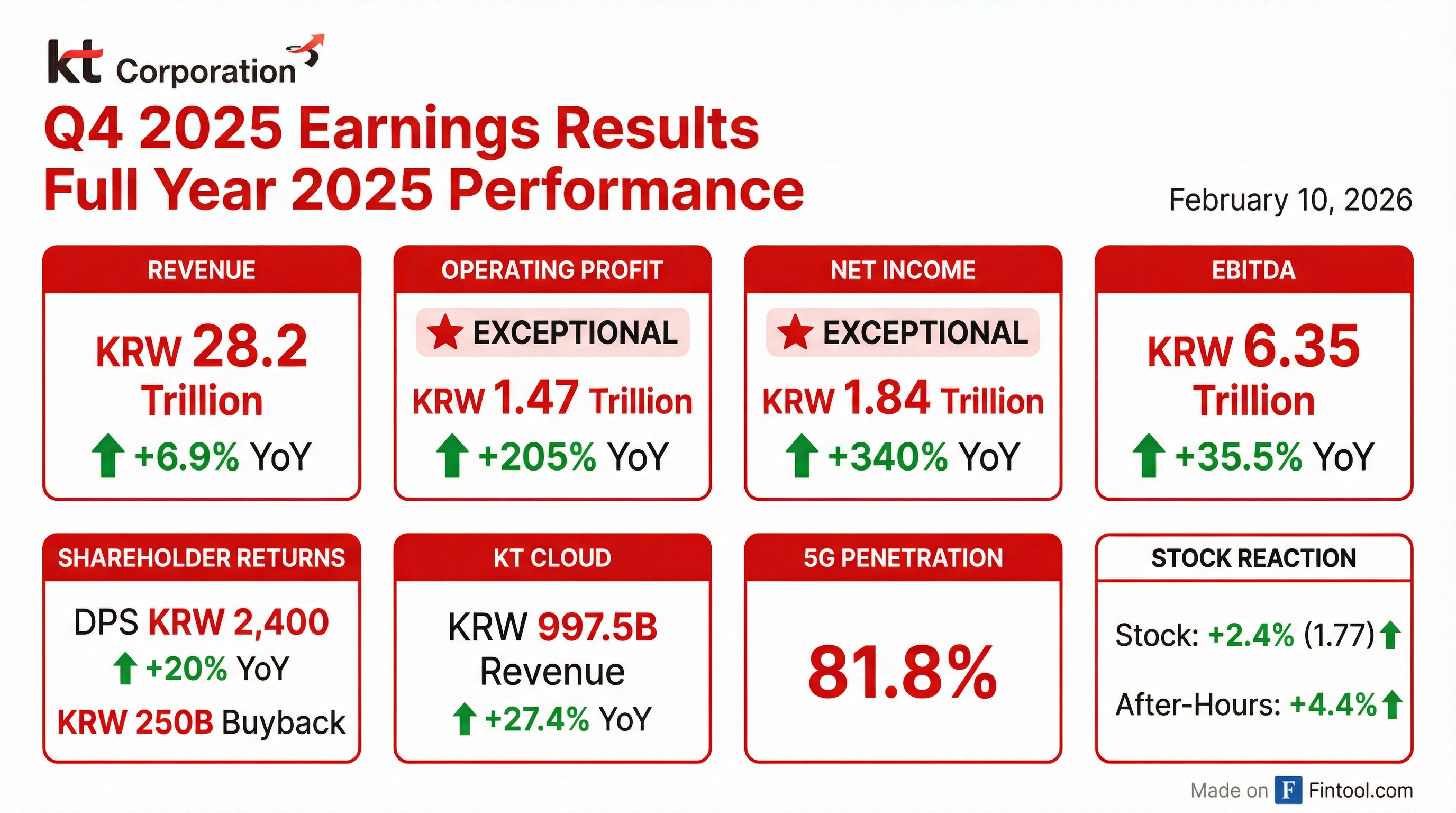 - KT reported robust financial performance for FY 2025, with operating revenue increasing 6.9% year-on-year to KRW 28,244.2 billion, operating profit surging 205% to KRW 2,469.1 billion, and net income growing 340.4% to KRW 1,836.8 billion.