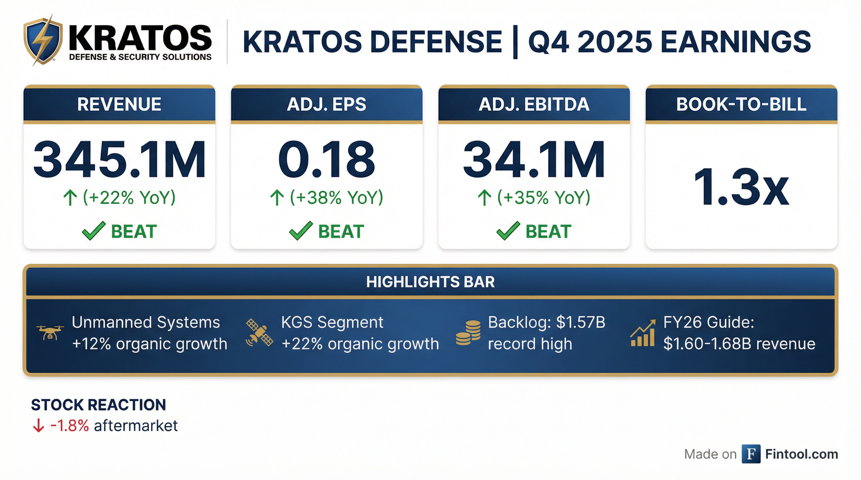 - Kratos Defense & Security Solutions reported Q4 2025 revenues of $345.1 million, exceeding estimates, with 20% year-over-year organic revenue growth and an Adjusted EBITDA of $34.1 million. The company also achieved a 1.3 to 1 book-to-bill ratio and a record backlog of $1.573 billion.