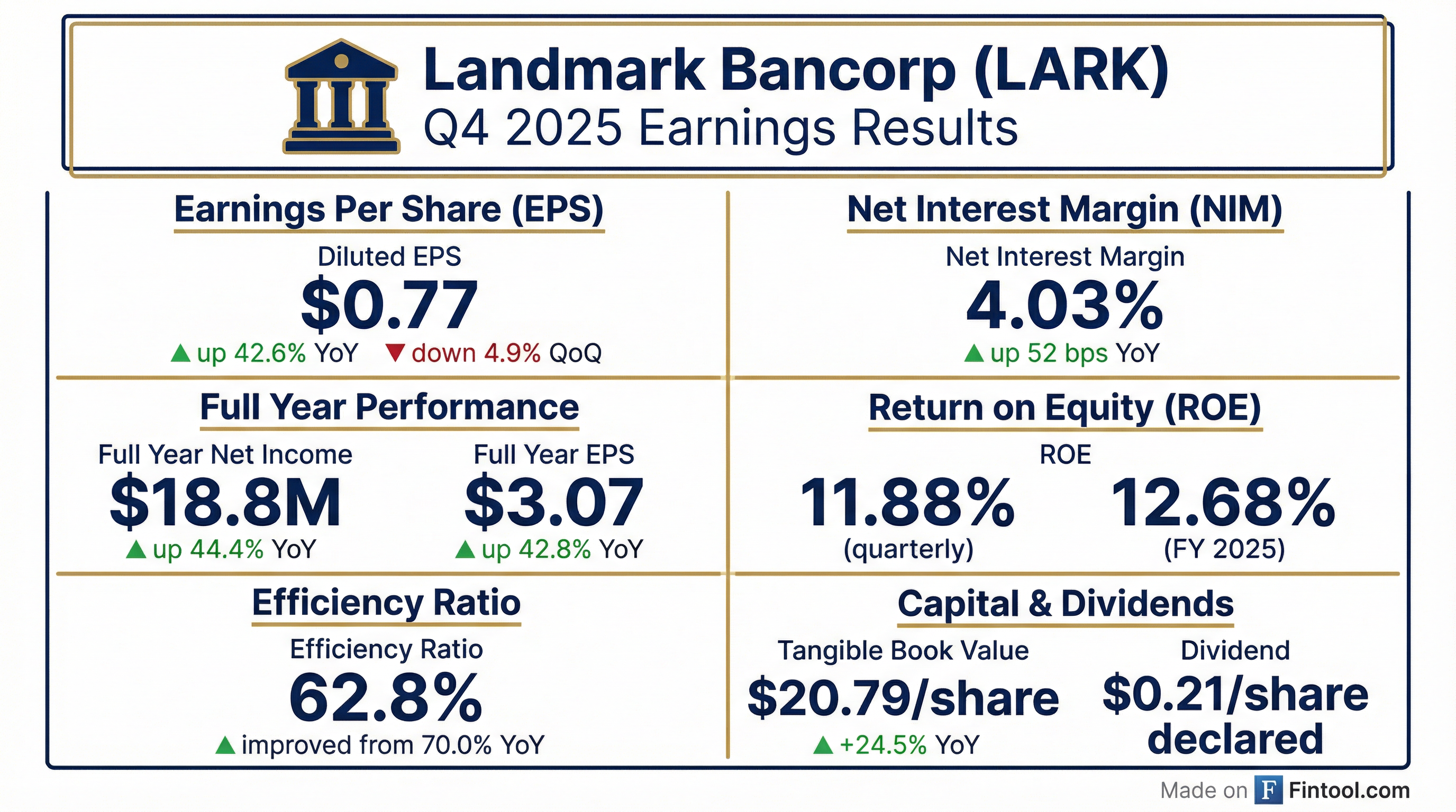 - Landmark Bancorp reported net income of $4.7 million and diluted earnings per share of $0.77 for Q4 2025. For the full year 2025, net income was $18.8 million and diluted EPS was $3.07, representing a 43% increase over 2024 earnings per share.