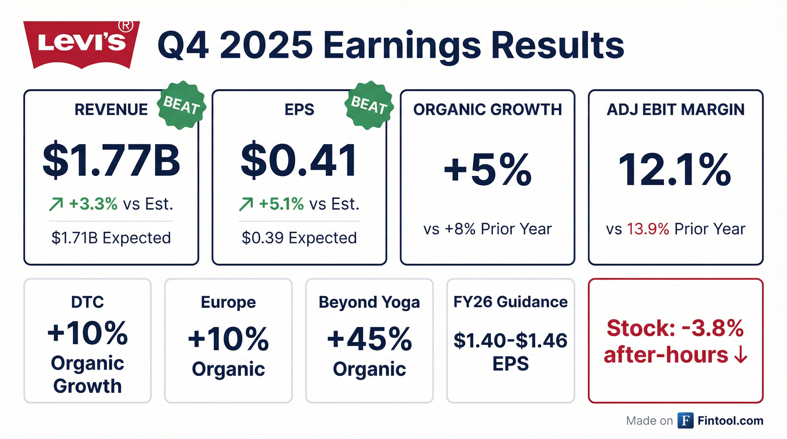 - Levi Strauss & Co. reported Q4 2025 net revenues of $1.8 billion, a 1% increase on a reported basis and 5% on an organic basis, compared to Q4 2024. Diluted earnings per share from continuing operations was $0.40, and adjusted diluted earnings per share was $0.41.