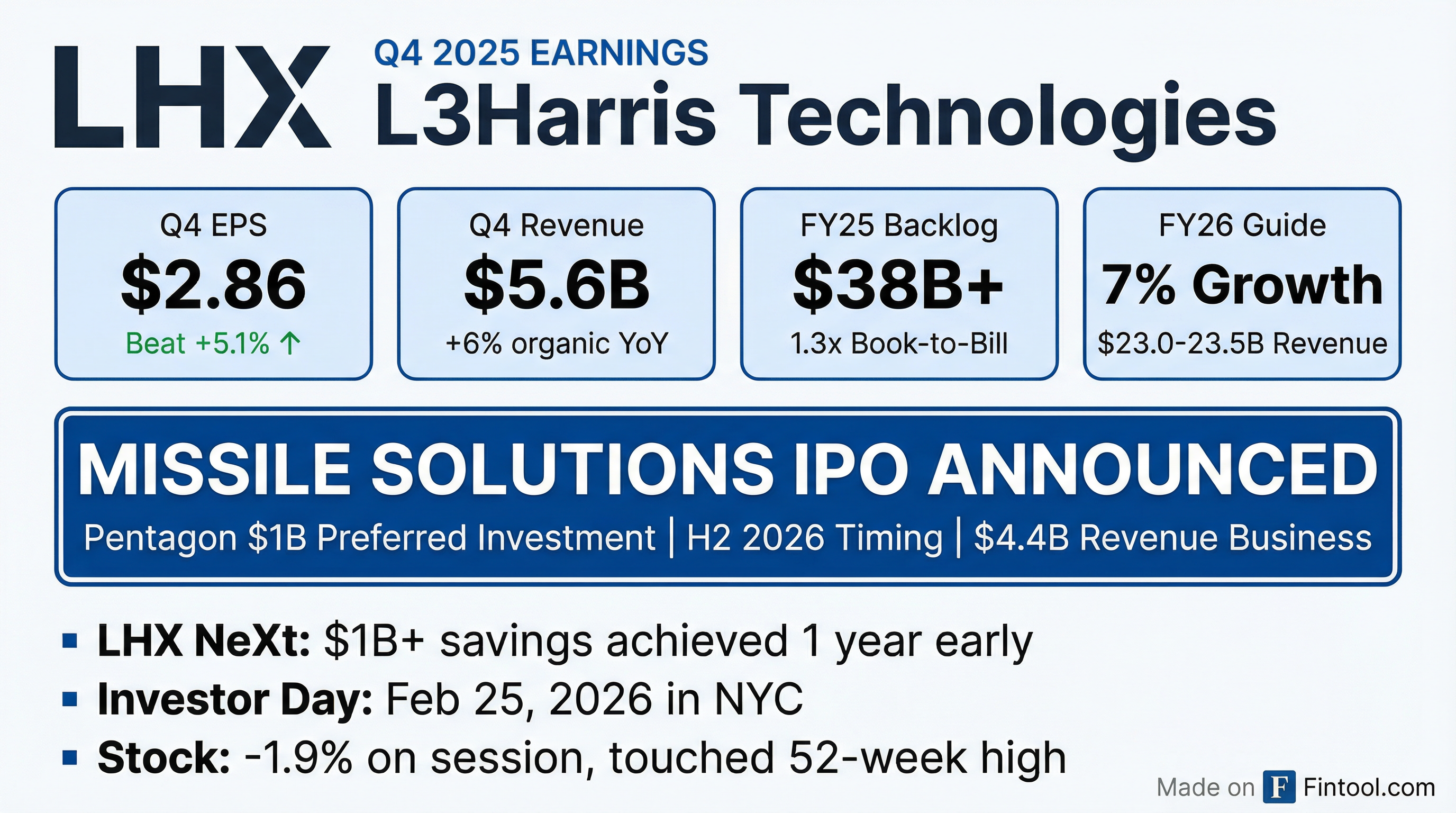 - L3Harris delivered 2025 revenue of $21.9 billion, up 3% year-over-year (5% organically), with a book-to-bill ratio of 1.3x, operating margin of 9.7%, and full-year diluted EPS of $8.53 (non-GAAP $10.73).