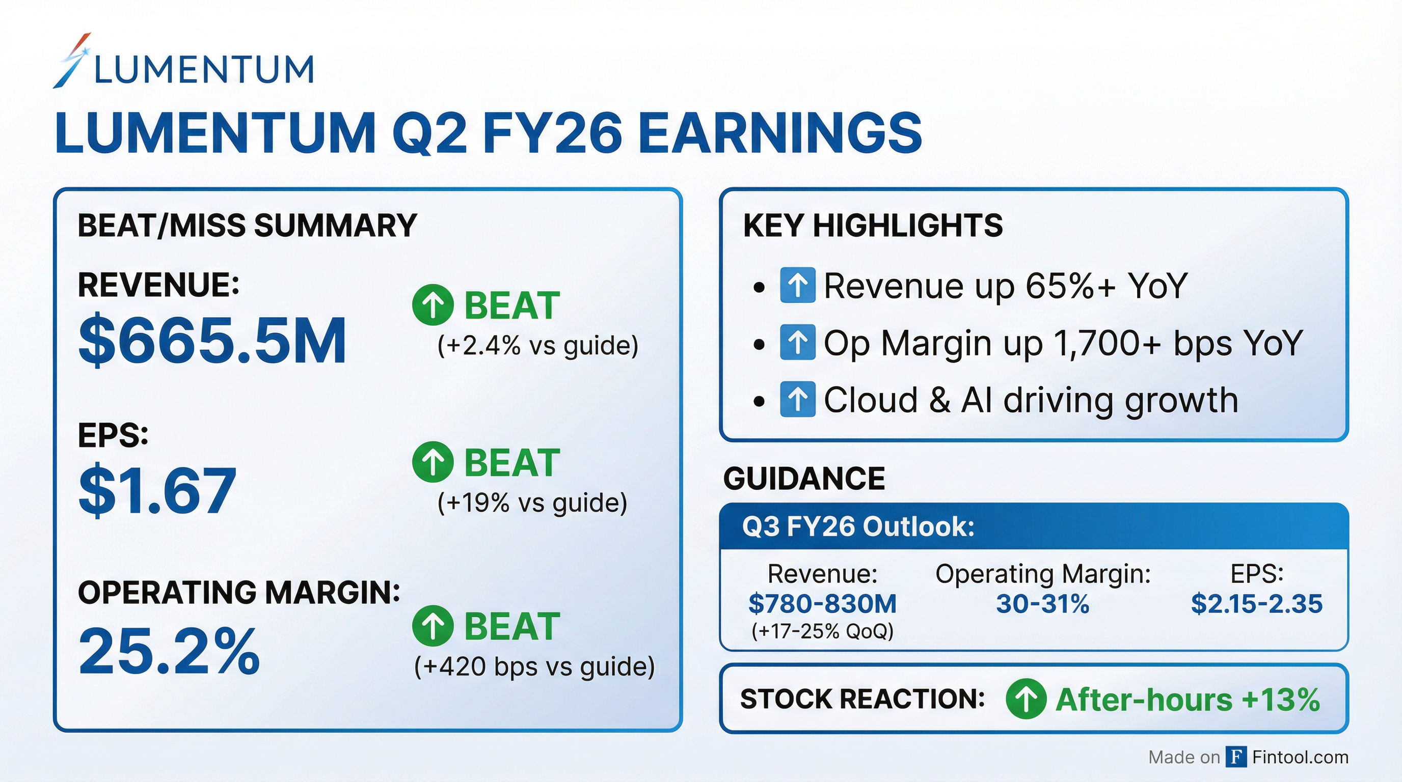 - Lumentum achieved record Q2 2026 revenue of $665.5 million, an over 65% year-over-year increase, with non-GAAP operating margin rising 1,730 basis points year-on-year to 25.2% and non-GAAP EPS of $1.67.