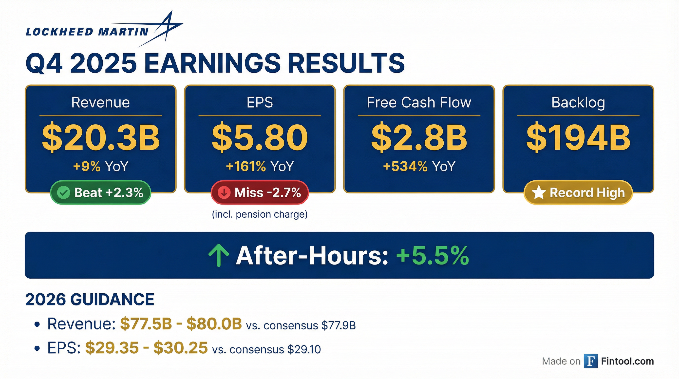 - Lockheed Martin reported Q4 sales of $20.3 billion (+9% YoY), segment operating profit of $2.1 billion, EPS of $5.80, and free cash flow of $2.8 billion.
