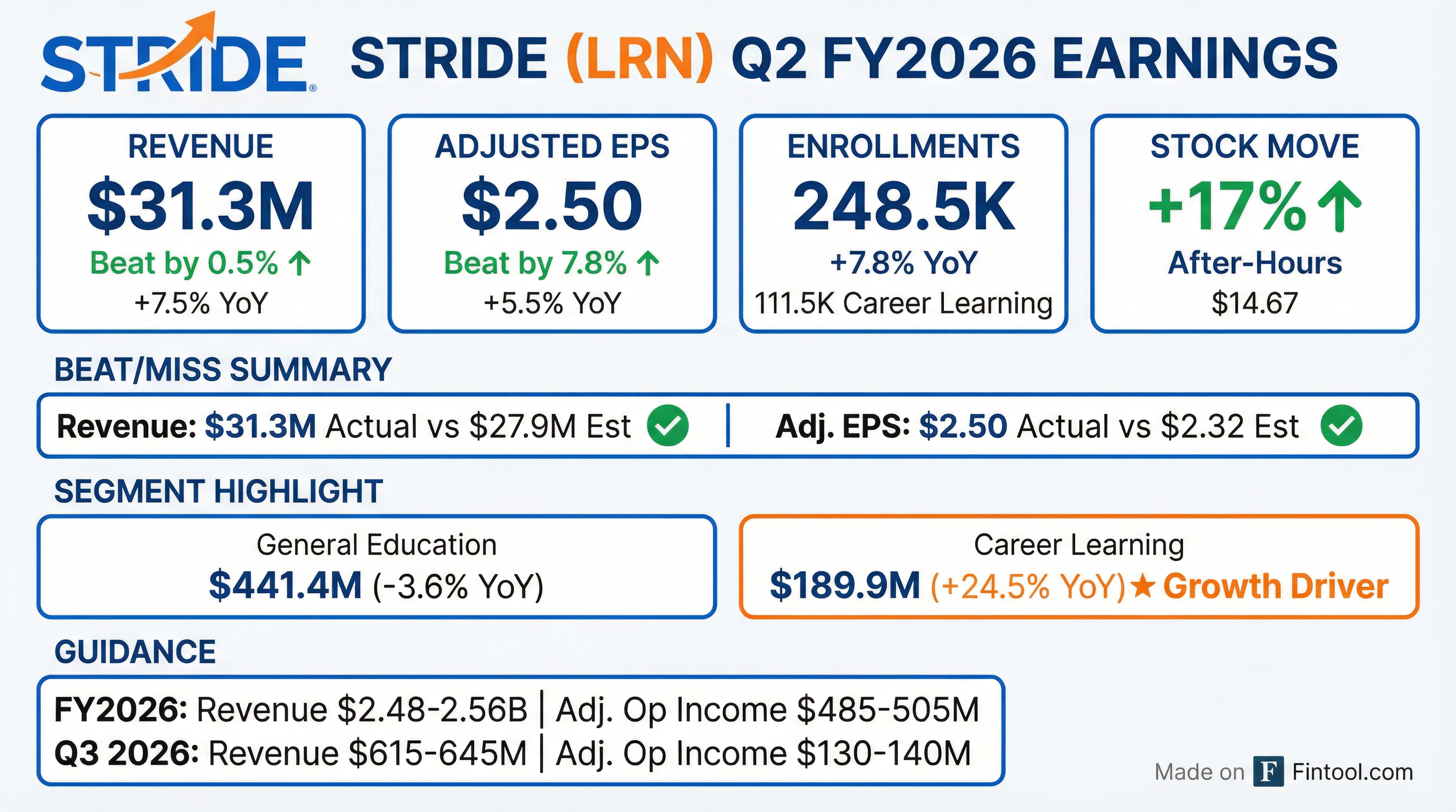 - Stride reaffirmed its full-year revenue guidance of $2.480-$2.555 billion and raised its Adjusted Operating Income guidance to $485-$505 million.