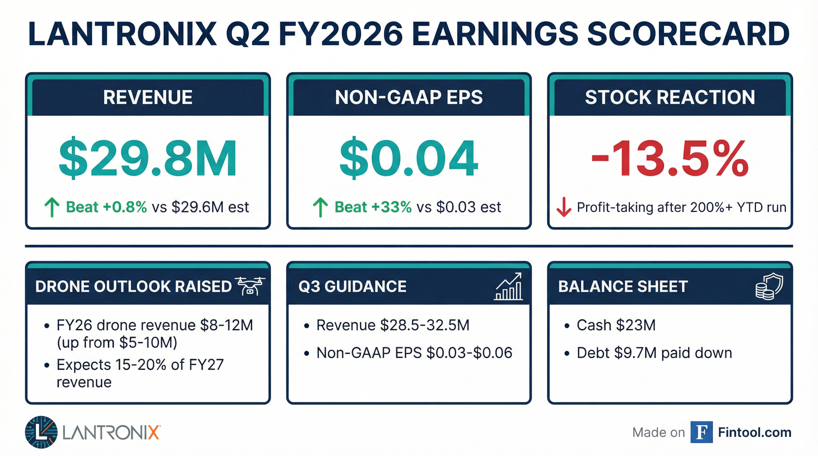 - For Q3 FY2026, Lantronix provided a financial outlook of Revenue between $28.5 million to $32.5 million (midpoint $30.5 million) and Non-GAAP EPS of $0.03 to $0.06.