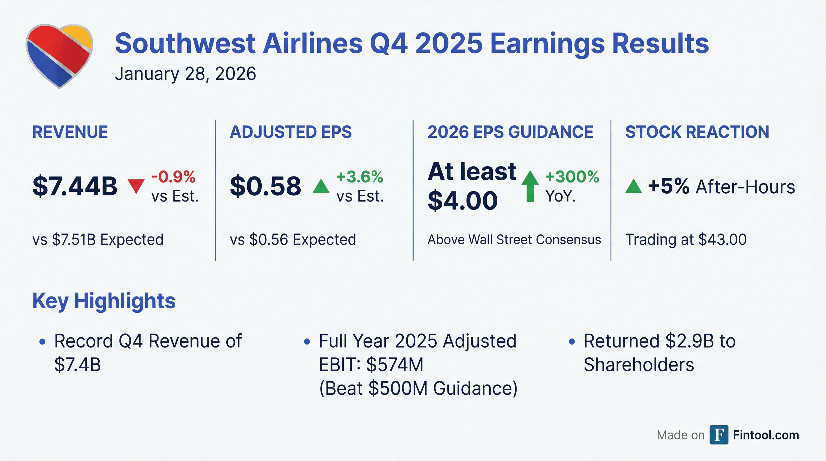 - Southwest Airlines reported record full-year operating revenues of $28.1 billion, net income of $441 million ($0.79 EPS), and adjusted EBIT of $574 million for 2025.